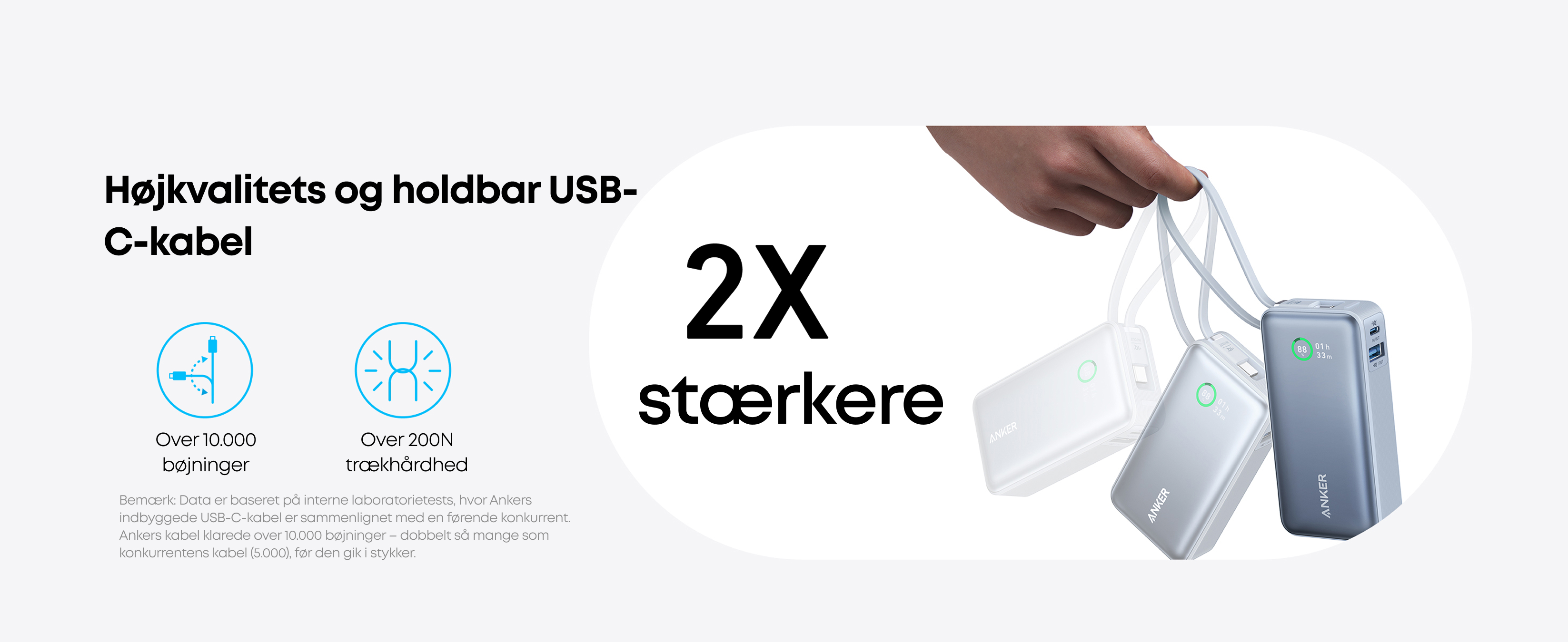 Anker Nano Power Bank (30 W, indbygget USB-C-kabel) og velkomstguide