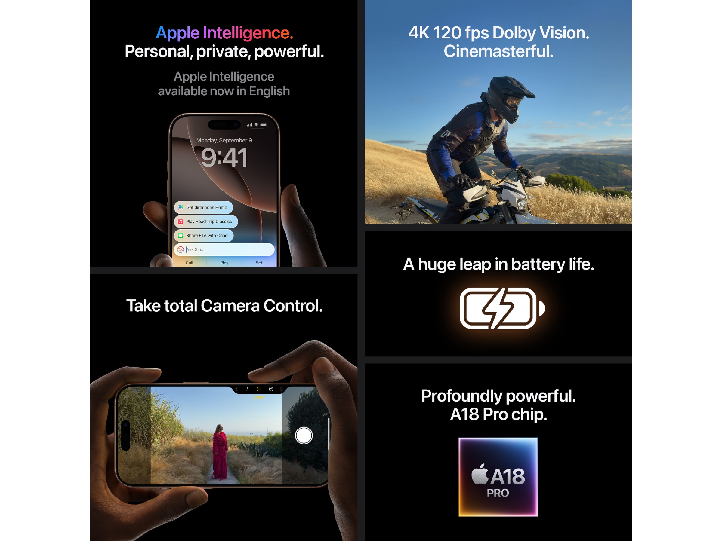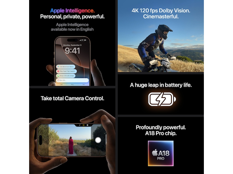 iPhone 16 Pro. Med et storslået design i titanium. Kamera kontrol. Dolby Vision i 4K ved 120 fps. Og A18 Pro-chippen.