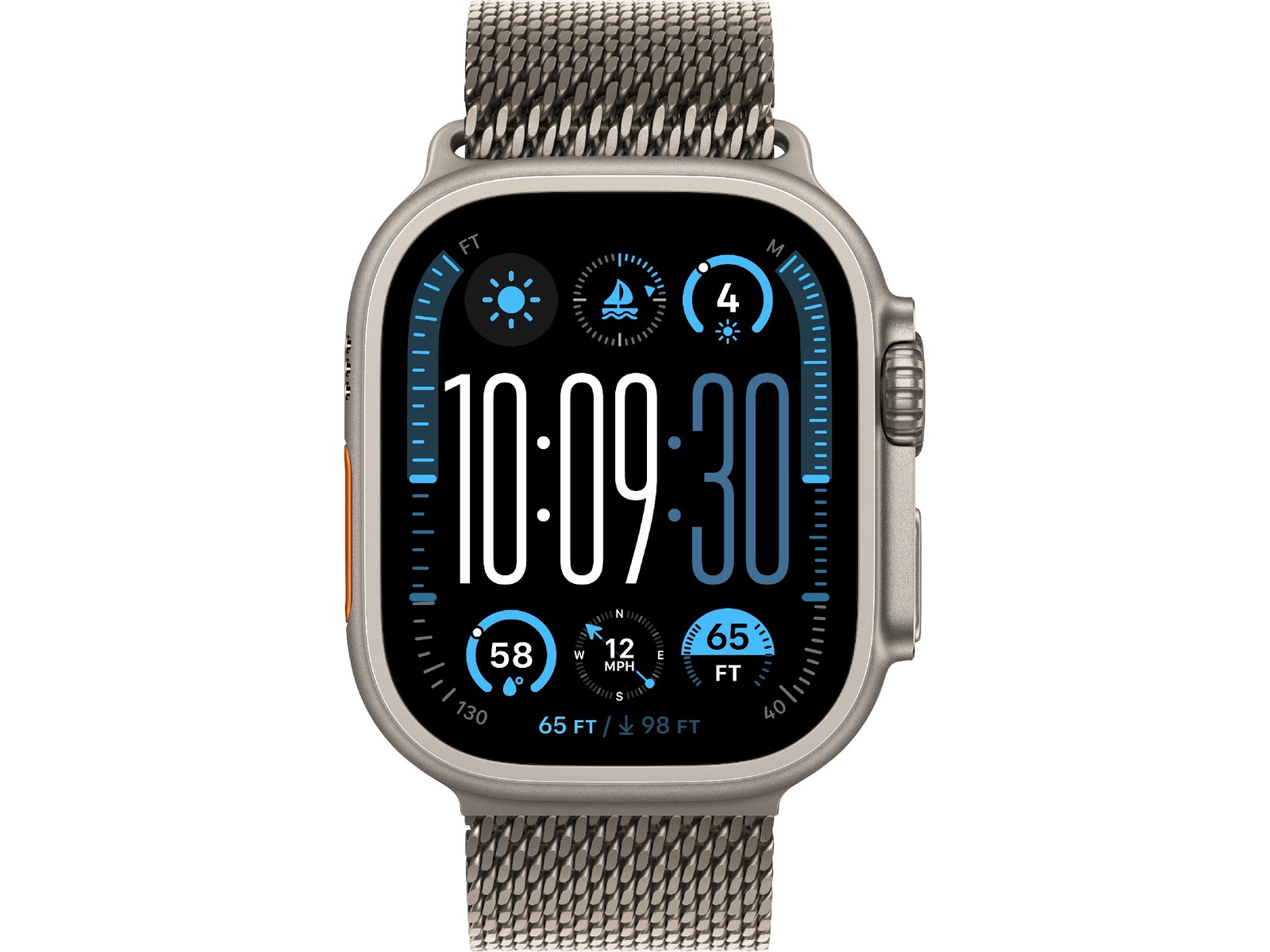 Denne rem er CO₂‑neutral. Milanoremmen i titanium indeholder 85 % genanvendt indhold målt efter vægt, 100 % af elektriciteten til produktionen dækkes af ren energi, og mindst 50 % af alle CO₂-neutrale Apple Watch-produkter bliver fragtet uden brug af fly.