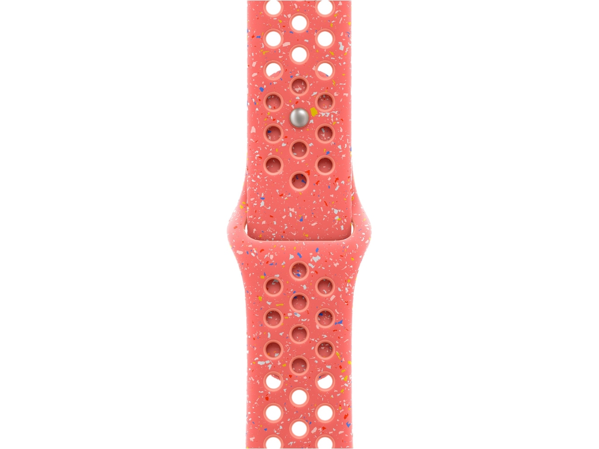 Nike Sportsremmen har formpressede huller, så huden kan ånde. Den er solid og stærk – og overraskende blød. Designets farverige flager placeres i et tilfældigt mønster, og derfor er hver rem unik. Det bløde og kompakte materiale sidder elegant omkring dit håndled og føles behageligt mod huden. Stiften i stiftlukningen er lavet i aluminium og har en flot mat finish.