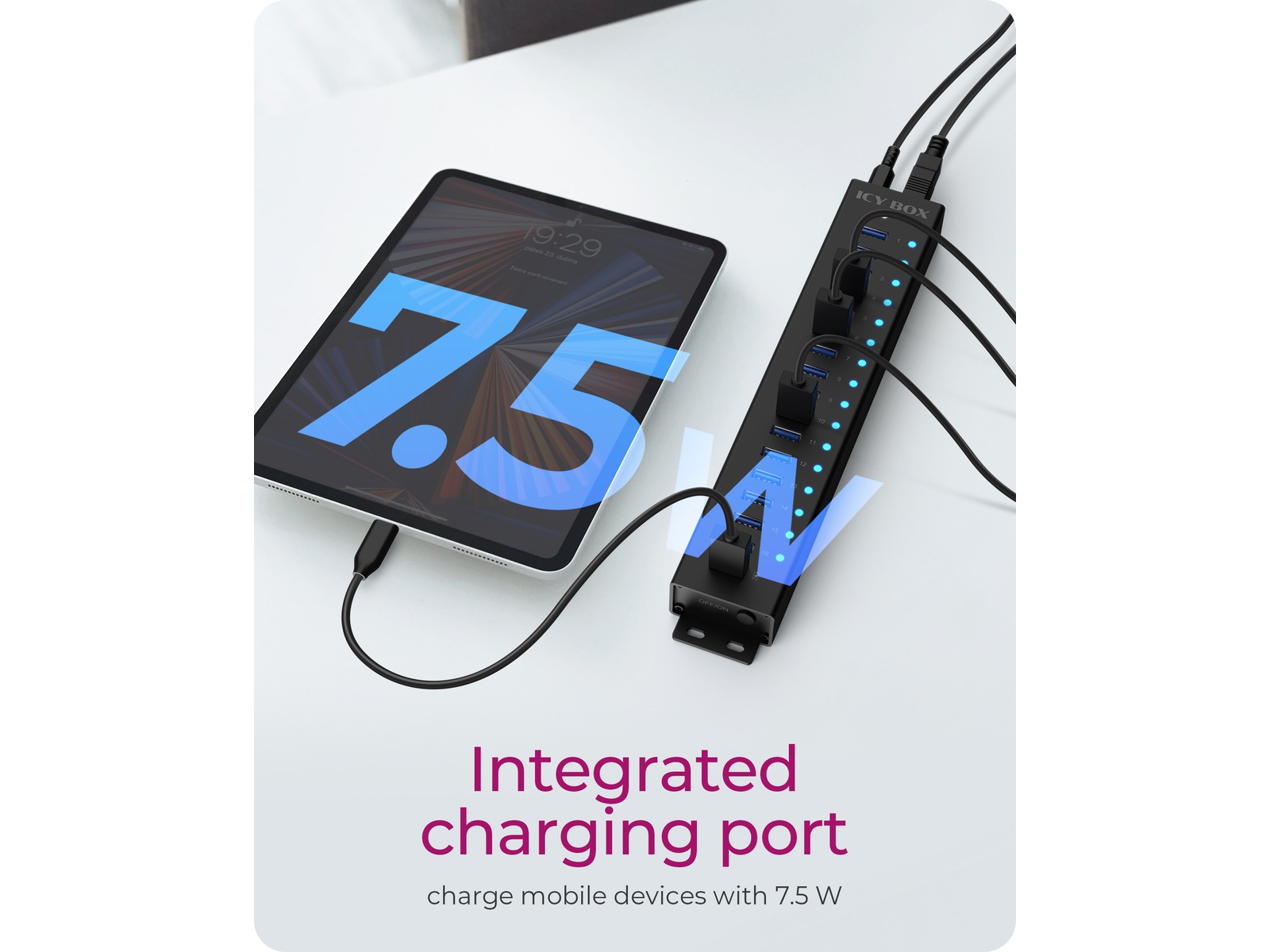The IB-HUB1717-U3 features a dedicated USB charging port that can charge mobile devices with up to 7.5 W of power. The output of the connected computer is used for this purpose and data processes are not affected by this. Therefore, a separate power supply unit is not required.