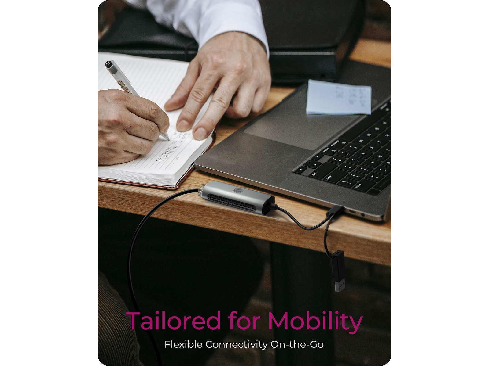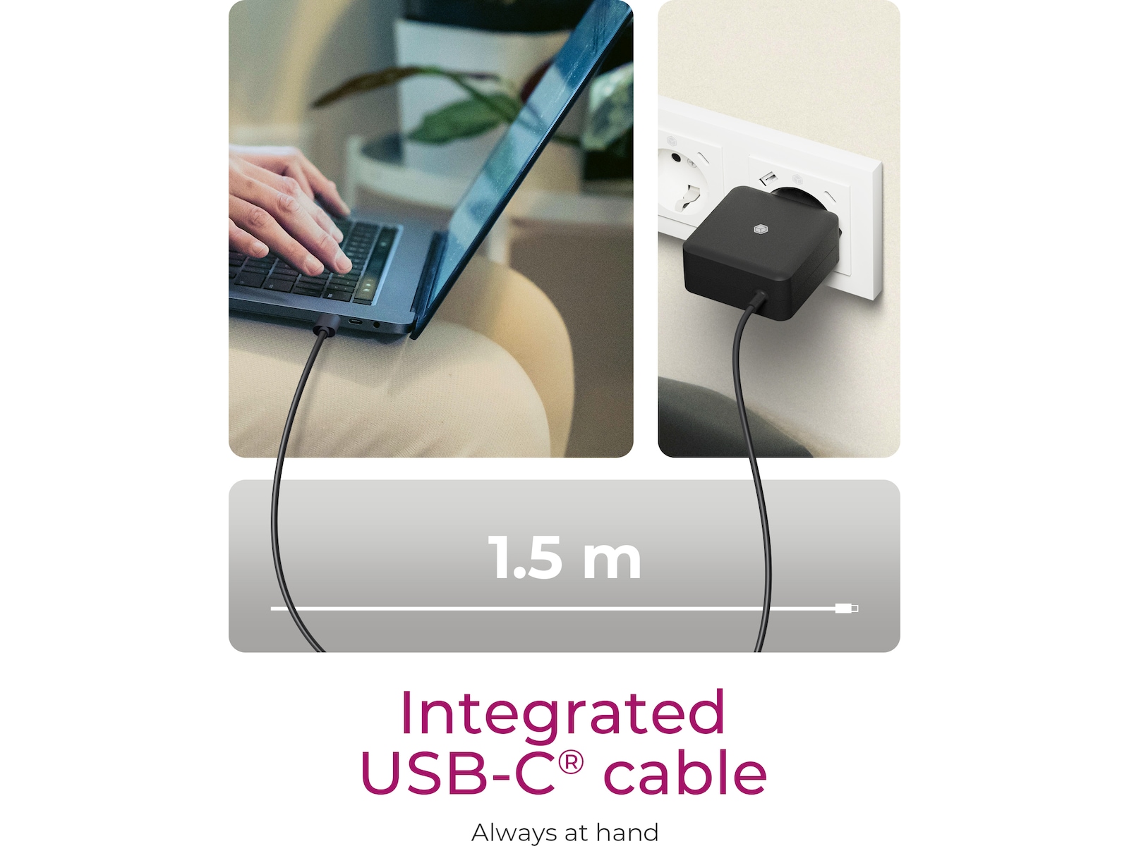 - Integreret USB-C kabel: Det integrerede 1,5 m kabel giver praktisk opladning og giver fleksibilitet til at bruge den tilsluttede enhed, mens den stadig oplader