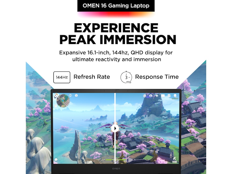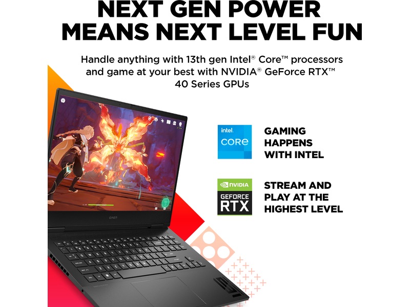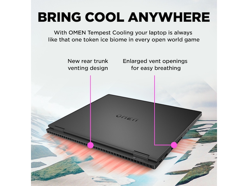 Den 16" store OMEN-gaminglaptop er klartil brug, uanset hvor du er. Få kraft som i en desktop med en 13. generations Intel® Core™-processor og et moderne NVIDIA®-grafikkort, som begge kan reguleres af forbedret intern afkøling. Skærmen er også imponerende med høj opløsning, jævn billedhastighed og uden genskær.