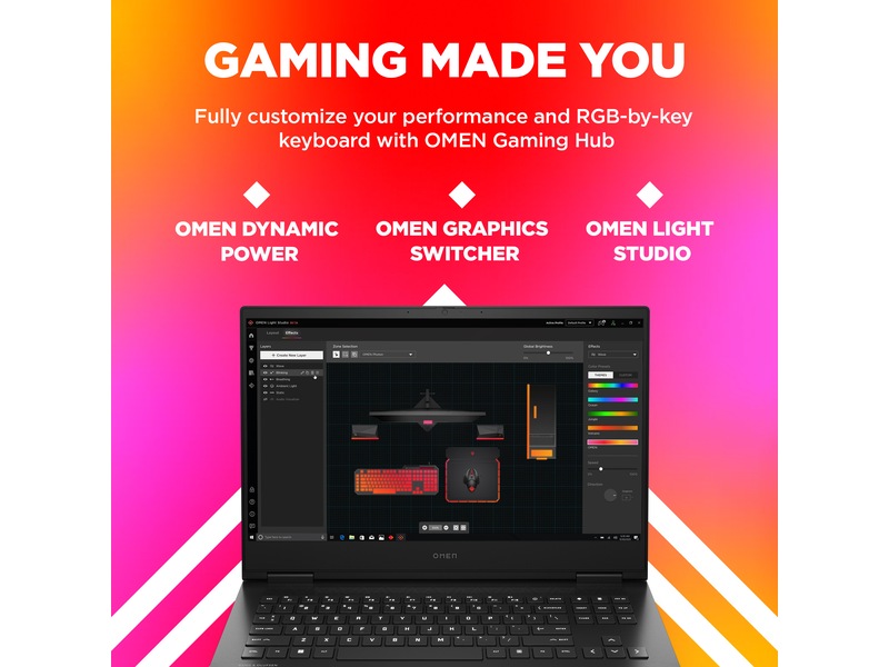 Gør det muligt at bagbelyse 4 uafhængige zoner med forskellige RGBtastaturlys. Der er skitseret WASD-tastertil markering af tastfunktioner. Det hele er nemt at betjene via OMEN Gaming Hub.