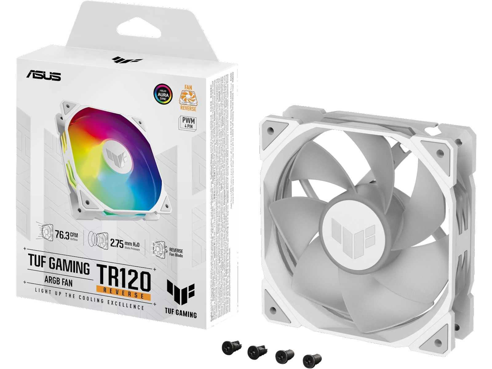 TUF Gaming TR120 ARGB Reverse er omhyggeligt optimeret og kan prale af et imponerende statisk tryk på 2,75 mmH2O og en klasseledende luftstrøm på 76,3 CFM. Den er lavet til at udmærke sig i både chassis- og radiatorapplikationer og sætter en ny standard for køleydelse. Det omvendte blæserblad giver øget fleksibilitet og forbedret luftstrømskontrol til planlægning af din chassisluftkanal.