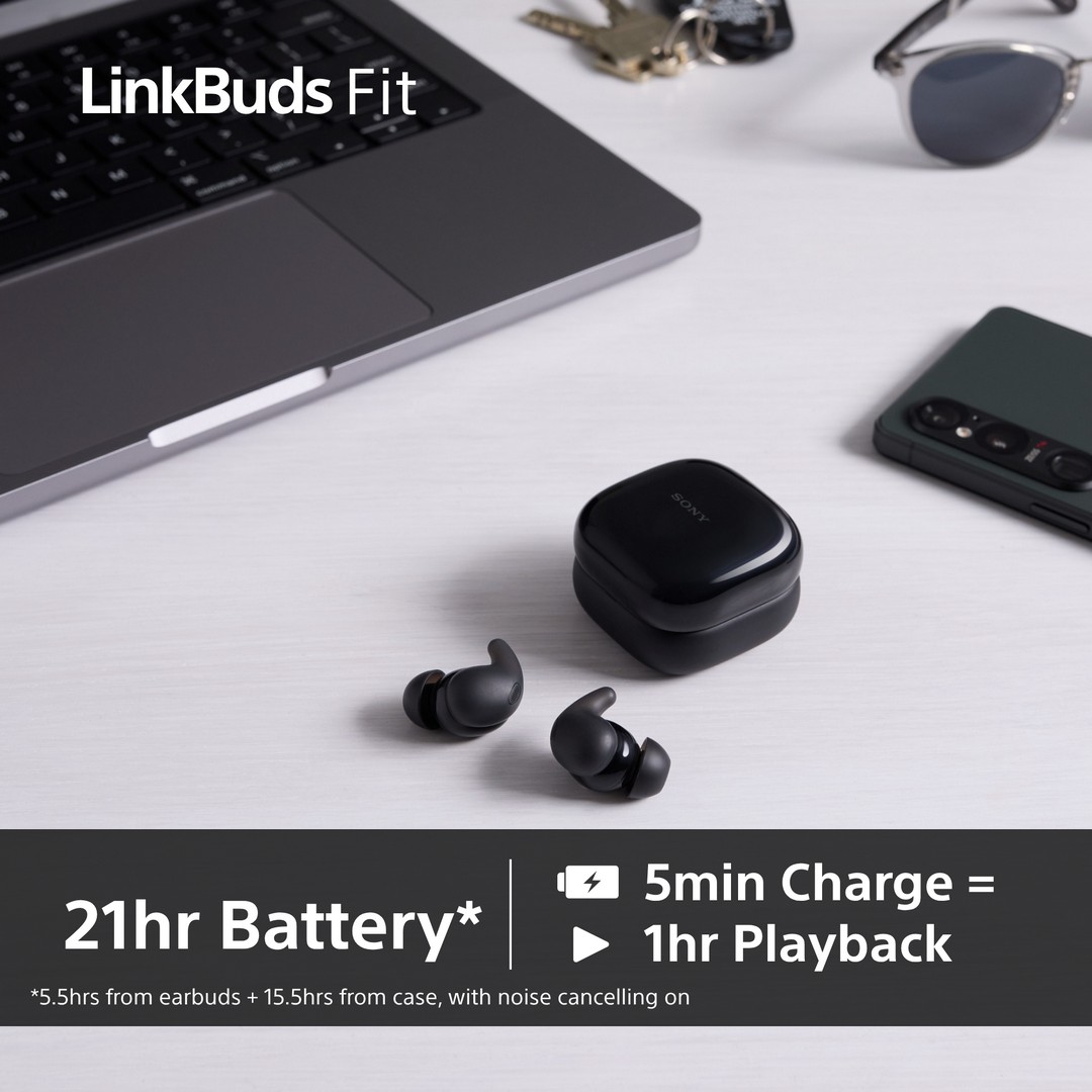 LinkBuds Fit giver dig op til 21 timers samlet afspilningstid, så du kan nyde musik hele dagen. Øretelefonerne giver 5,5 timers kontinuerlig afspilning, mens det kompakte etui giver yderligere 15,5 timer. Hurtigopladningsfunktionen giver 1 times afspilning efter kun 5 minutters opladning, så du hurtigt kan fortsætte med at lytte, selv hvis batteriet løber tør.