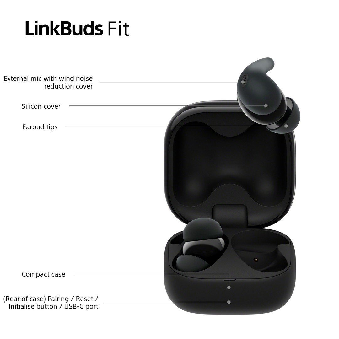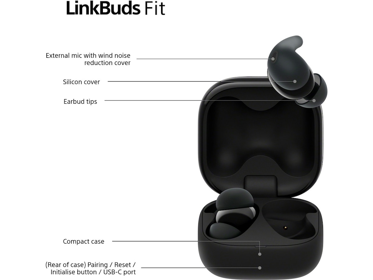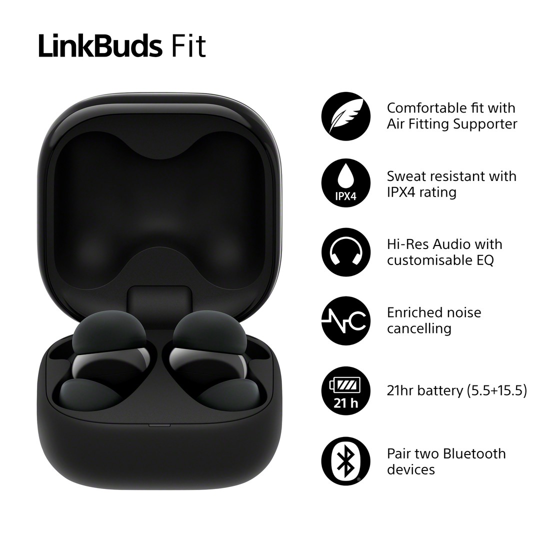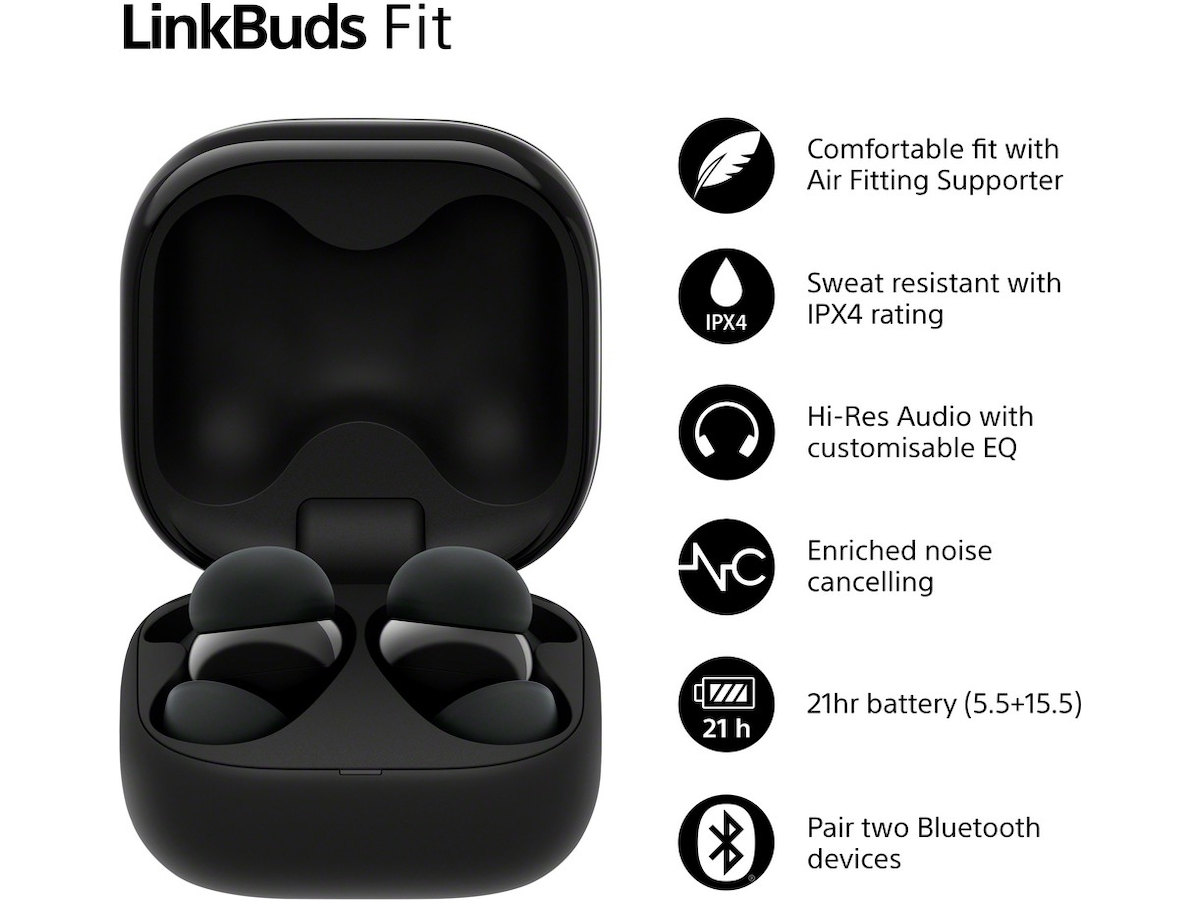 LinkBuds Fit giver stabilitet og komfort. Den smarte air fitting supporter sørger for en sikker pasform, og med lav vægt på kun 4,8 g pr. øretelefon kan de bruges længe uden ubehag. Med IPX4-klassificering tåler de både sved og regn – ideelt til både indendørs og udendørs brug.