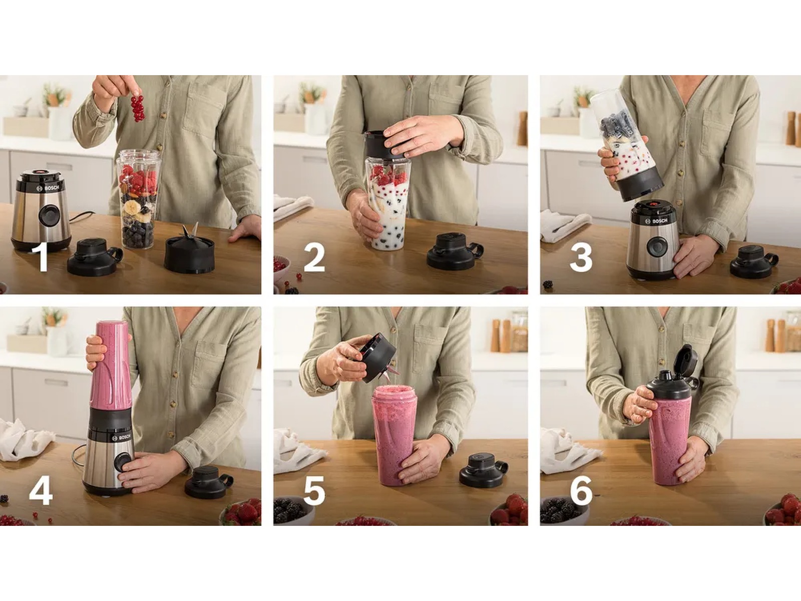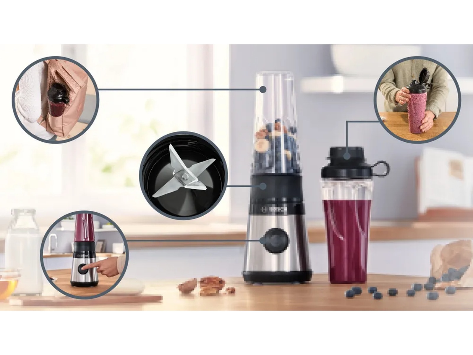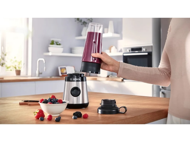Smoothies på farten med den kompakte og kraftfulde miniblender med lækagesikker Tritan ToGo-flaske og hus i rustfrit stål.
