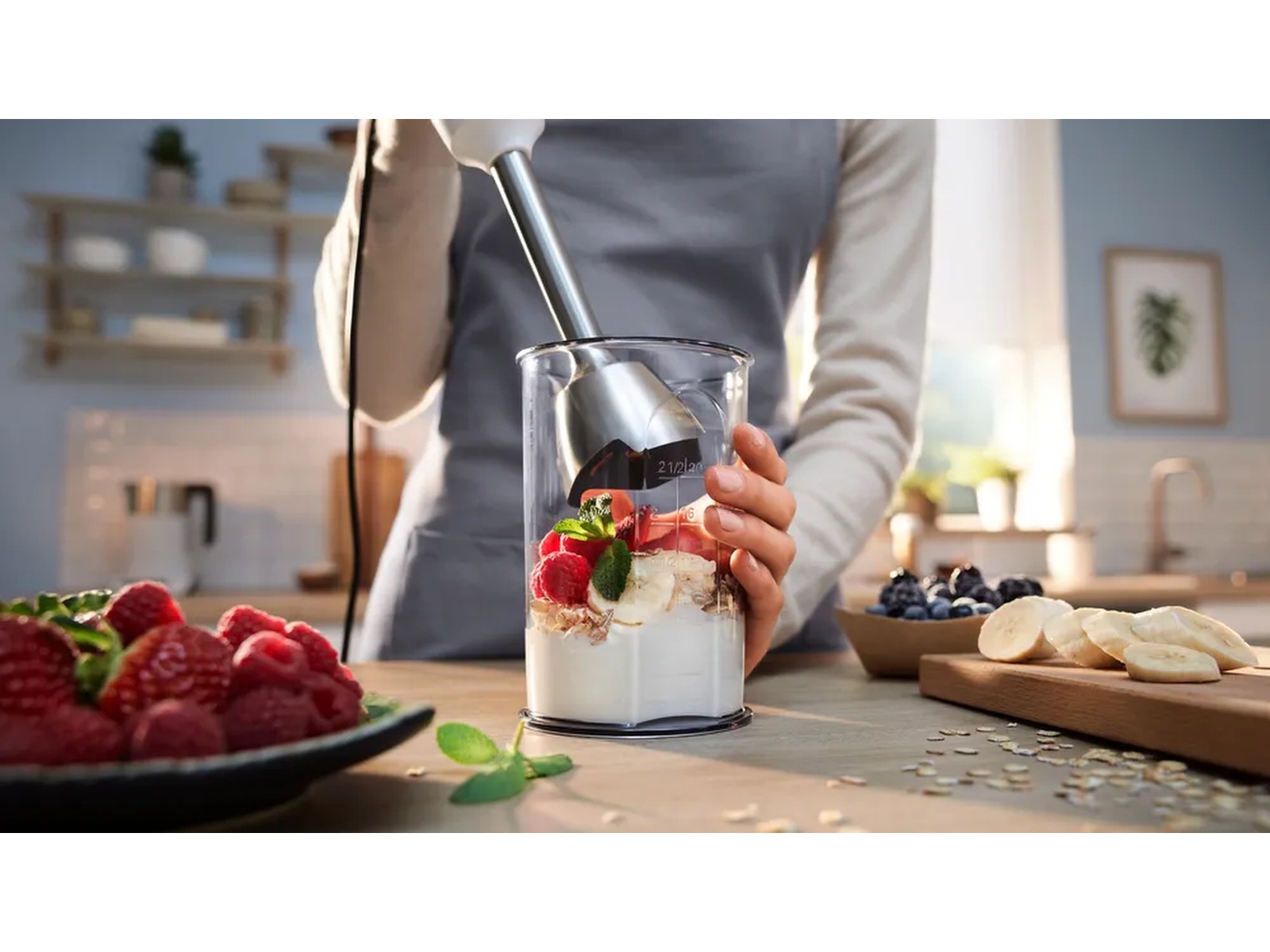 Nyd perfekte resultater uden stænk og spild. AntiSplash-teknologien forhindrer sprøjt under brug. Urdesign sikrer effektiv blanding og et rodfrit køkken.