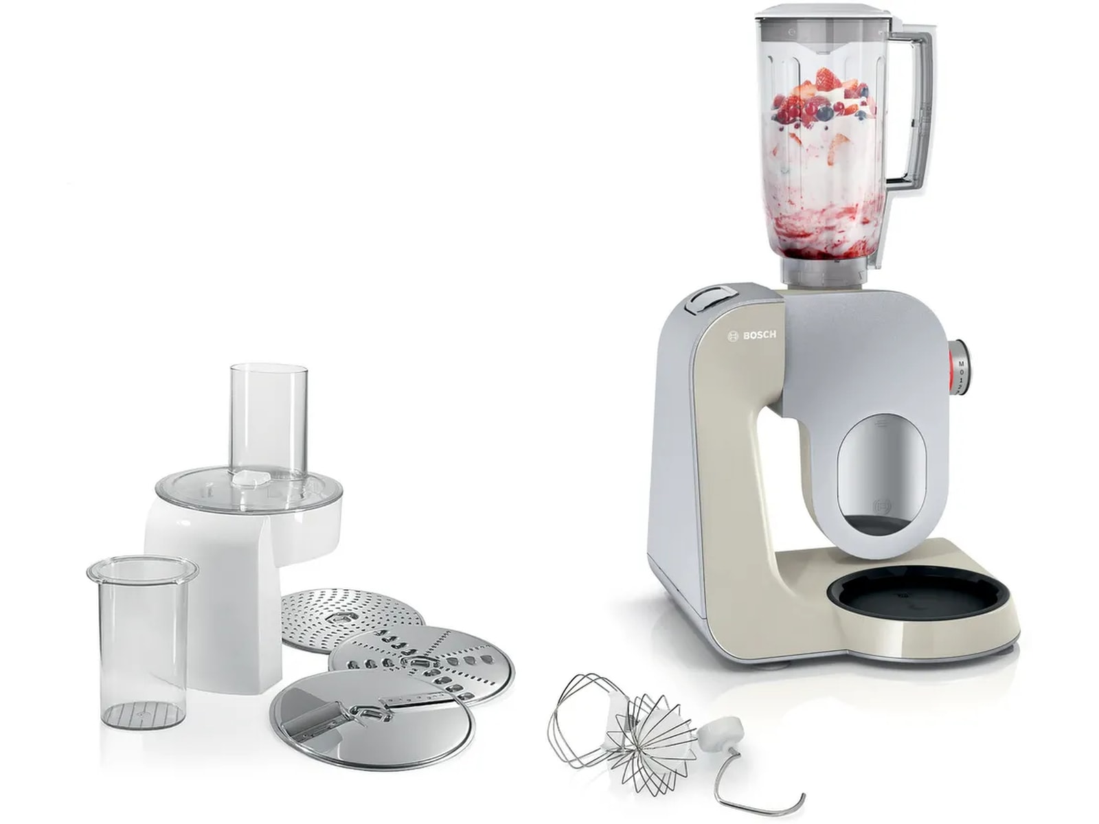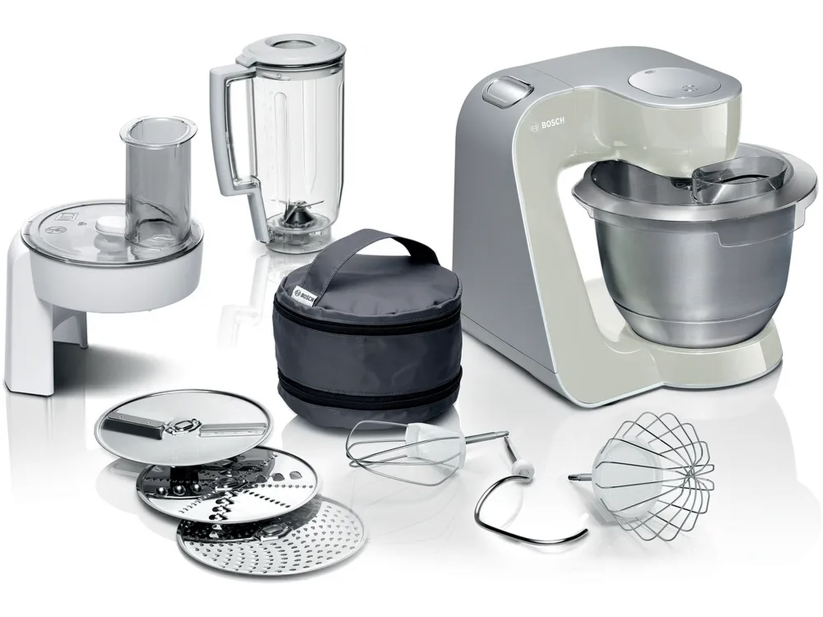 Den kraftfulde køkkenmaskine i mineralgrå/sølv til alsidig madlavning og bagning.