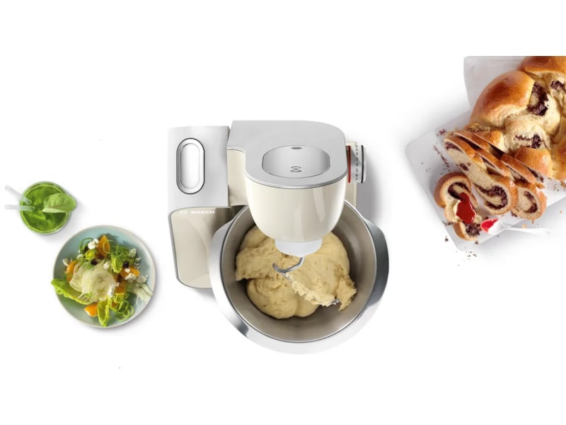 Står sikkert og roligt på bænken. Ved hjælp af gummifødderne står maskinen solidt på bænken, selv med tungere deje. Skjulte stikdåser for ekstra sikkerhed og en elektronisk lås forhindrer, at maskinen starter utilsigtet.
