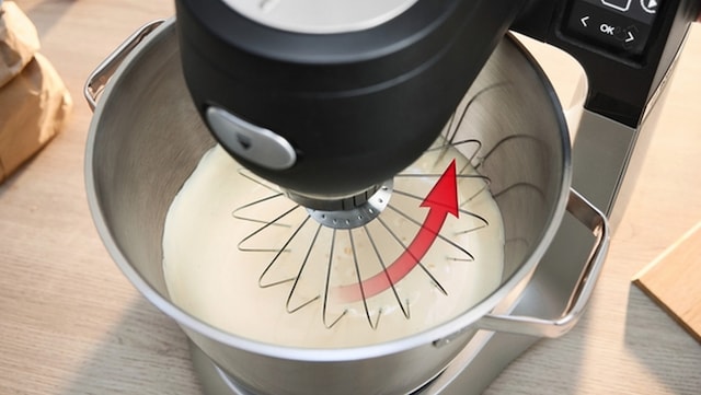 Undgå unødigt spild ved bagning. Den automatiske parkeringsposition for dejkrog og piskeris skaber plads til lettere påfyldning. Værktøjet stopper altid bagerst i skålen, så der er mere plads til påfyldning foran skålen.
