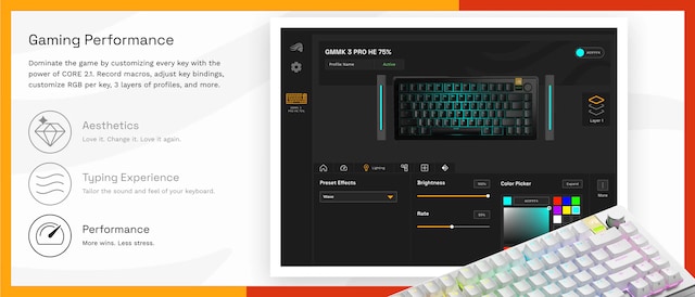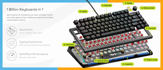 Verdens mest tilpasselige gaming-tastatur, der er i stand til over 1 milliard mulige konfigurationer, og giver spillere fuld kontrol over alle aspekter af deres oplevelse: Spilydelse, skriveoplevelse og æstetik.