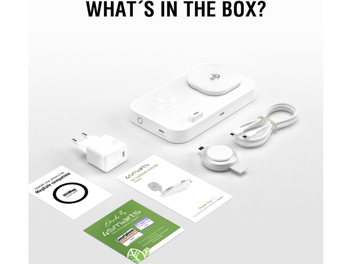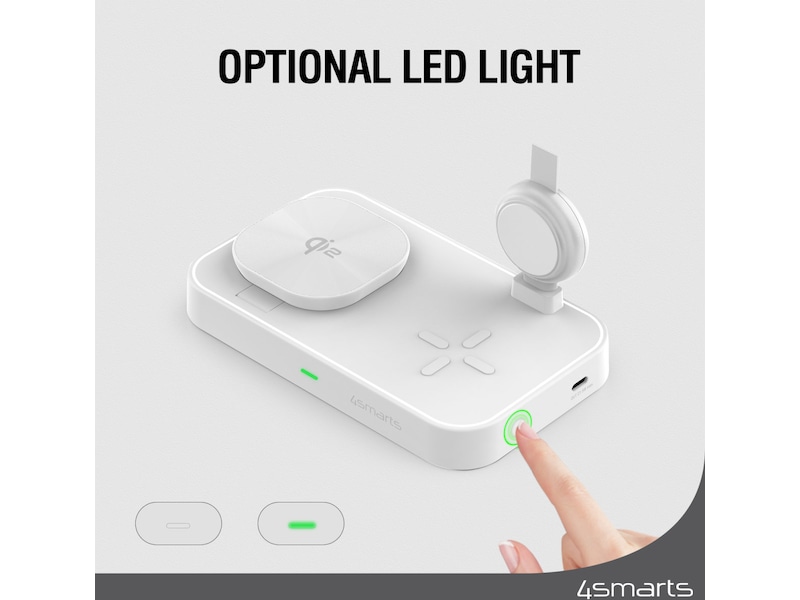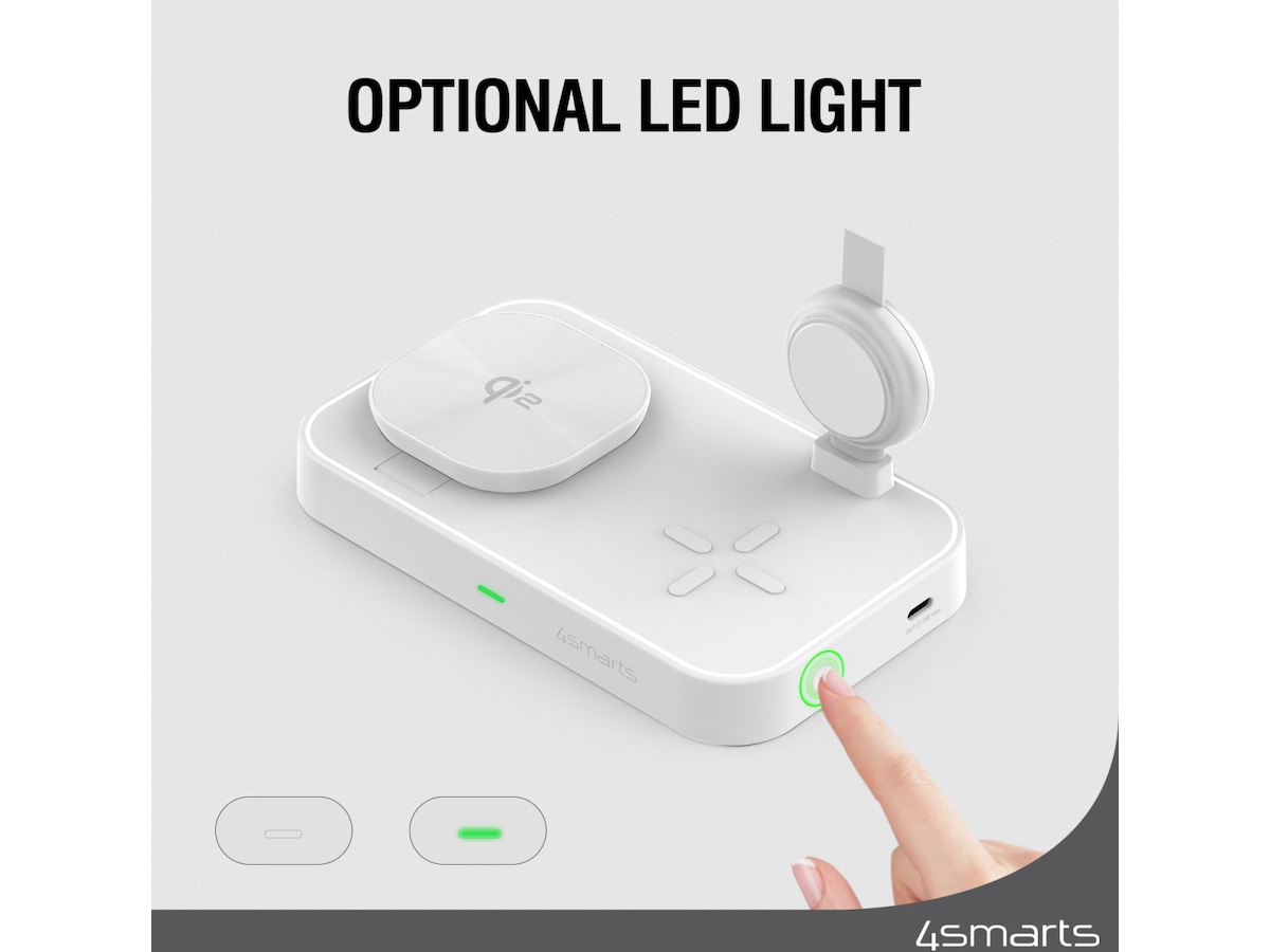 - 3-i-1 opladningsoplevelse: Oplad din smartphone (15W), headset (5W) og Apple Watch (5W) trådløst og samtidig direkte på stationen eller brug den aftagelige Apple Watch oplader separat