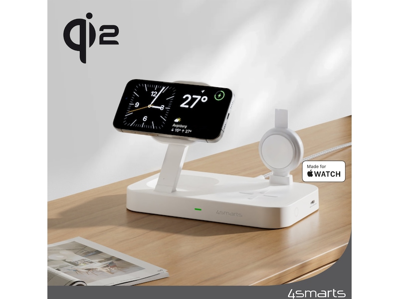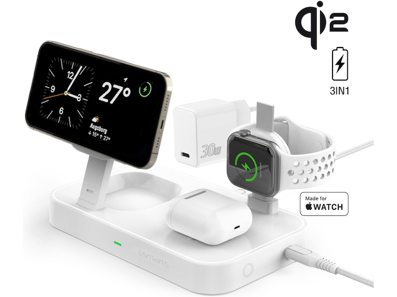 Nyd maksimal fleksibilitet med vores 3-i-1 Qi2 trådløse ladestation: perfekt til din iPhone, din Apple Watch og dine TWS hovedtelefoner. Stationen tilbyder 15W trådløs hurtiglading til din iPhone og 5W opladning til dine hovedtelefoner. Et højdepunkt er den alsidige Apple Watch-lader: Oplad din Apple Watch direkte på stationen via et USB-C-port eller fleksibelt via eksterne kilder som en powerbank, smartphone, laptop eller den medfølgende 30W strømadapter. Vores alsidige Apple Watch-lader er kompatibel med alle nuværende Apple Watch-modeller fra Series 1 til 9, SE og Ultra.