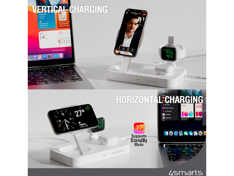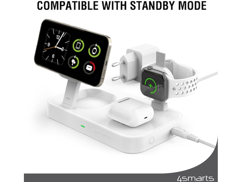 - Fleksibel smartphone-position: Oplad smartphones i liggende eller stående format, optimeret til Apples Standby-funktion