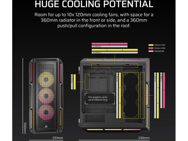 Det rummelige interiør rummer op til 10x 120 mm eller 4x 140 mm køleventilatorer samt flere 60 mm tykke radiatorer, inklusive op til 360 mm foran eller på siden og en 360 mm skub/træk i taget .