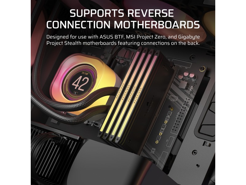 Valideret til brug med ASUS BTF-, MSI Project Zero- og Gigabyte Project Stealth-bundkort med tilslutninger på bagsiden af kortet, så dit udsyn ikke bliver spoleret af kabler.