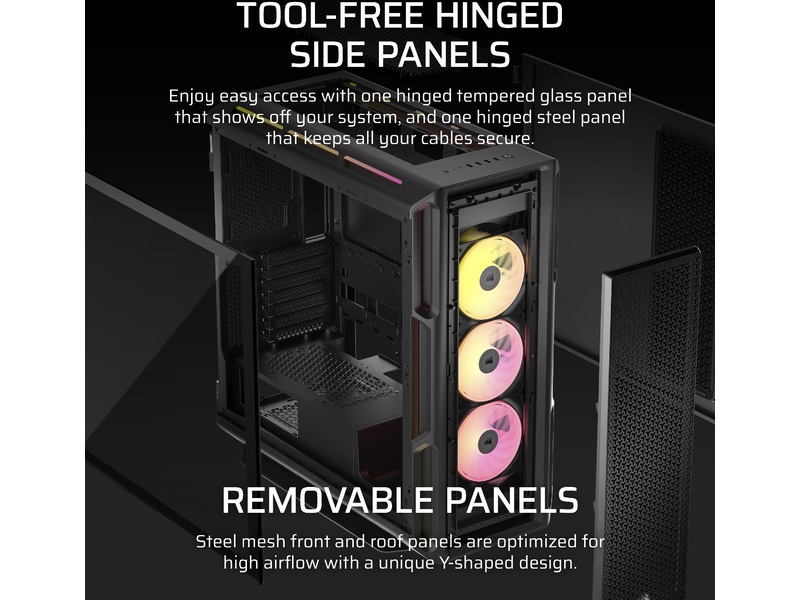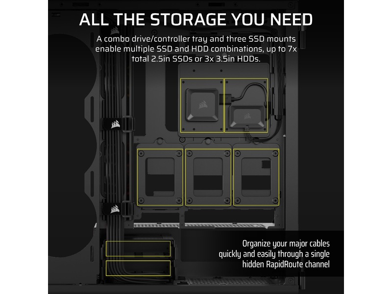 Bygmestervenlige funktioner, herunder CORSAIR RapidRoute-kabelstyringssystemet, strømliner din build ved at give dig mulighed for at føre kabler gennem en enkelt skjult kanal. Yderligere fordele som lodret monteringsstøtte, værktøjsfri hængslede sidepaneler og rigelige opbevaringsmuligheder forbedrer byggeoplevelsen. Med to kombinerede drevbakker og tre SSD-beslag tilbyder 5000T LX RGB alt, hvad du behøver for at skabe en fantastisk, højtydende pc.