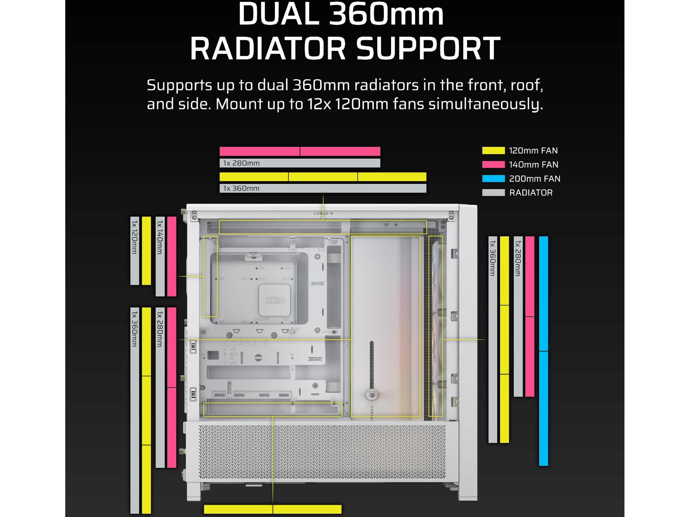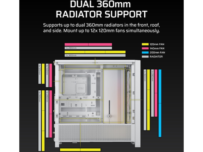 Tag din afkøling til næste niveau med tre monteringssteder til 360 mm radiatorer (front, tag og side). Monter op til 12x 120 mm blæsere samtidigt for at holde kold luft strømme ind, og varm luft udstødes hurtigt og effektivt.