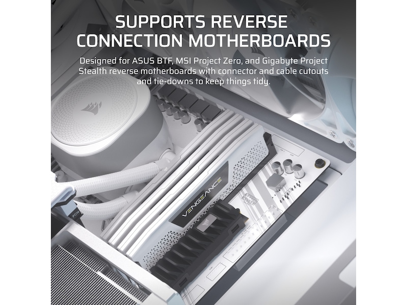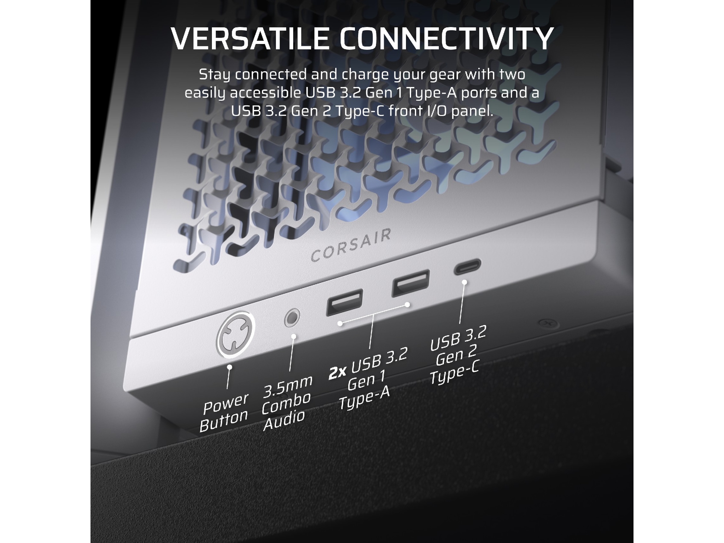 Forbliv forbundet, og oplad dit udstyr med to let tilgængelige USB 3.2 Gen 1 Type-A-porte og en USB 3.2 Gen 2 Type-C front I/O panel. Vil du have forskellige forbindelser? Bedre hastighed? Anderledes layout? I/O-panelet kan nemt udskiftes med opgraderinger, der er tilgængelige på corsair.com.