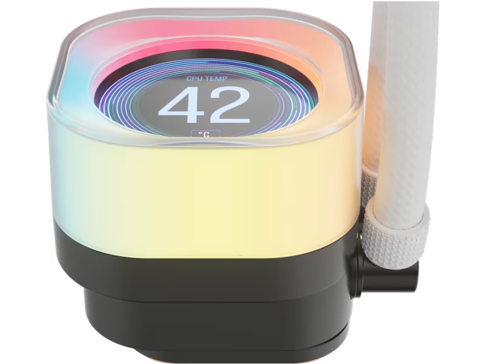 TITAN RX LCD's unikke pumpehættedesign viser belysningen fra 44 individuelt adresserbare RGB-LED'er rundt om pumpen.