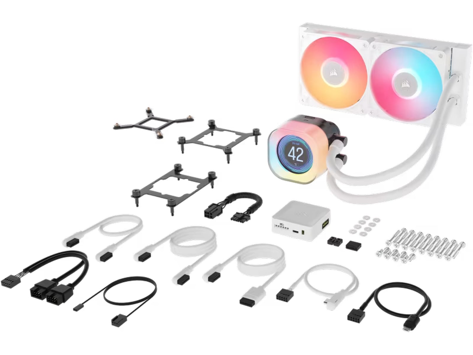 Pakkeindhold Kabel til USB strøm-splitter, iCUE Link-kabel (25 cm), PCIe-strømkabel, iCUE Link hub, Monteringsskruer til radiator, Blæserskruer, Monteringssæt, 2 broklemmestik, Micro USB 2.0-kabel, Tach-kabel, USB-C-kabel (60 cm), 2 iCUE LINK RX120 RGB blæsere, 2 x iCUE Link-kabel (60 cm)