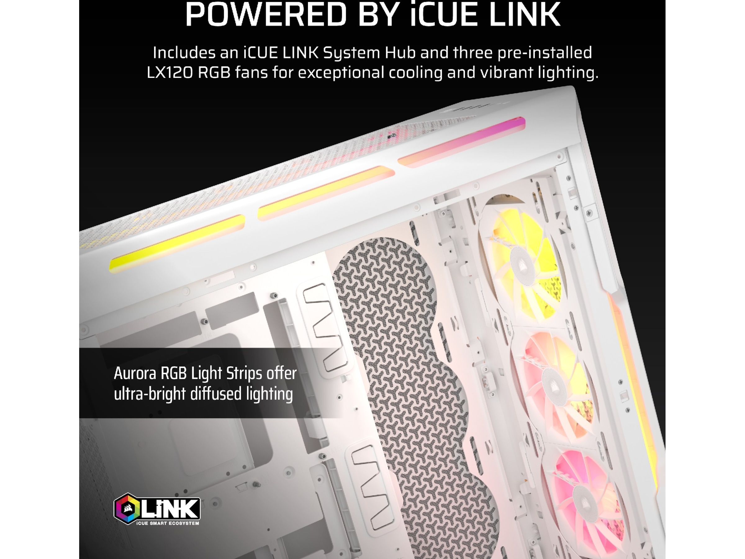 CORSAIR 5000T LX RGB gør et slående indtryk med sit slanke, unikke formede chassis og integrerede Aurora RGB Light Strips. Kickstart dit iCUE LINK-drevne system med den medfølgende System Hub og tre forudinstallerede iCUE LINK LX120 RGB-blæsere, hvilket sikrer fremragende køling og levende belysning. De ultra-lyse Aurora Light Strips giver jævn, diffus belysning uden hotspots.
