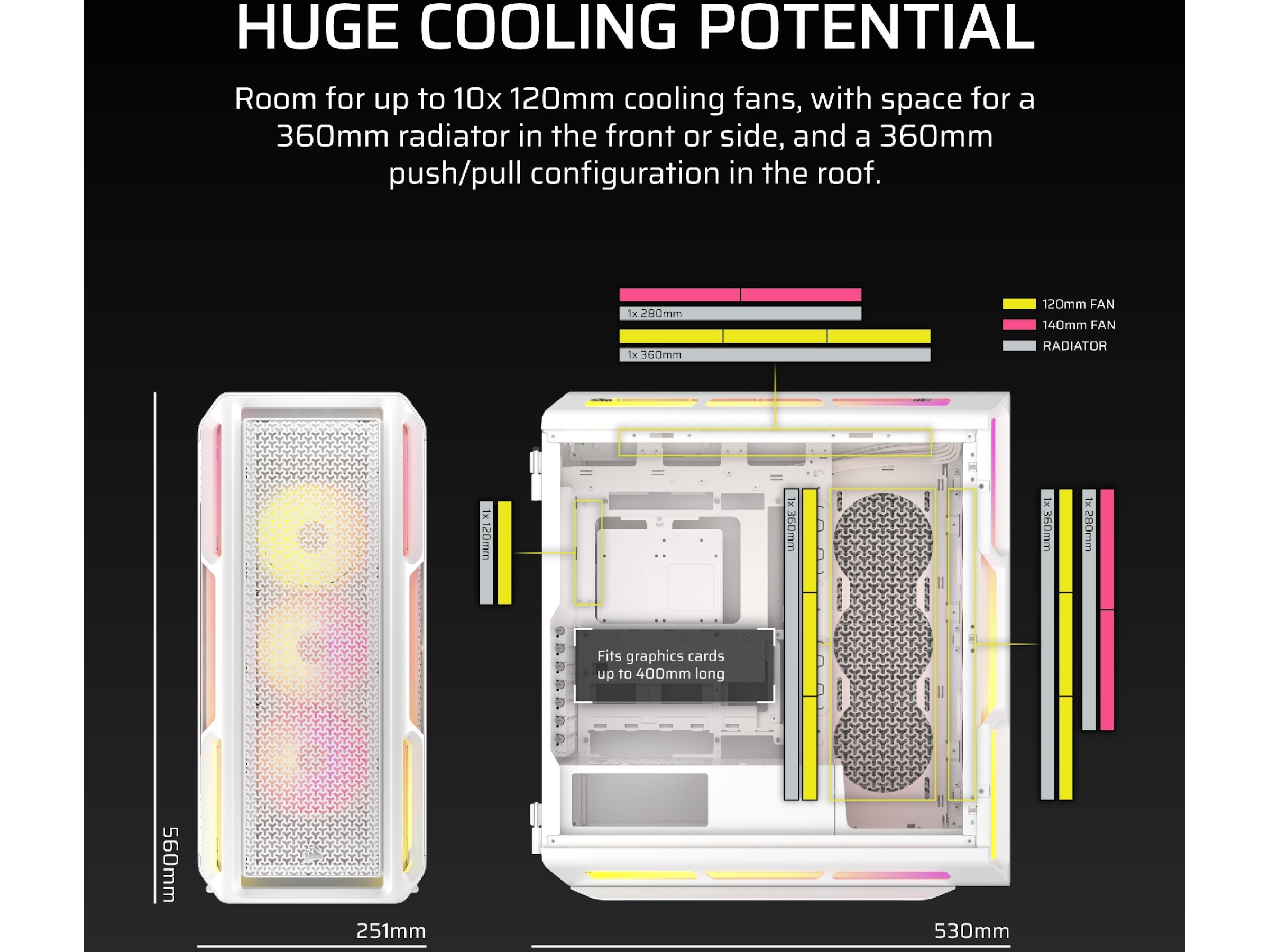 Det rummelige interiør rummer op til 10x 120 mm eller 4x 140 mm køleventilatorer samt flere 60 mm tykke radiatorer, inklusive op til 360 mm foran eller på siden og en 360 mm skub/træk i taget .