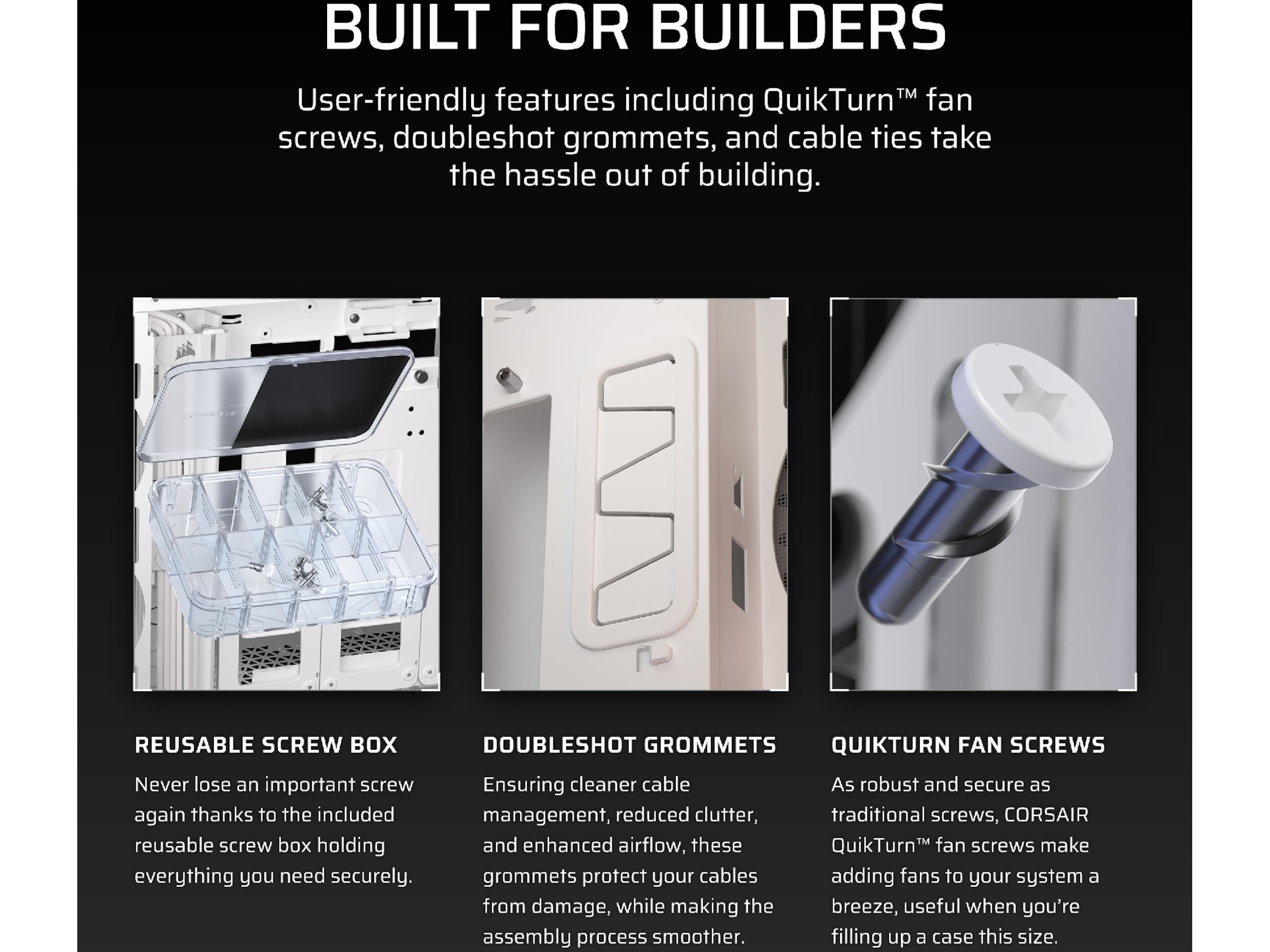 En række CORSAIR-innovationer forbedrer byggeoplevelsen, inklusive lodret monteringsstøtte uden ekstra beslag, quikturn-skruer med ét vrid, fleksible dobbeltskudsgennemføringer og udvendige udskæringer til kabel ledelse.