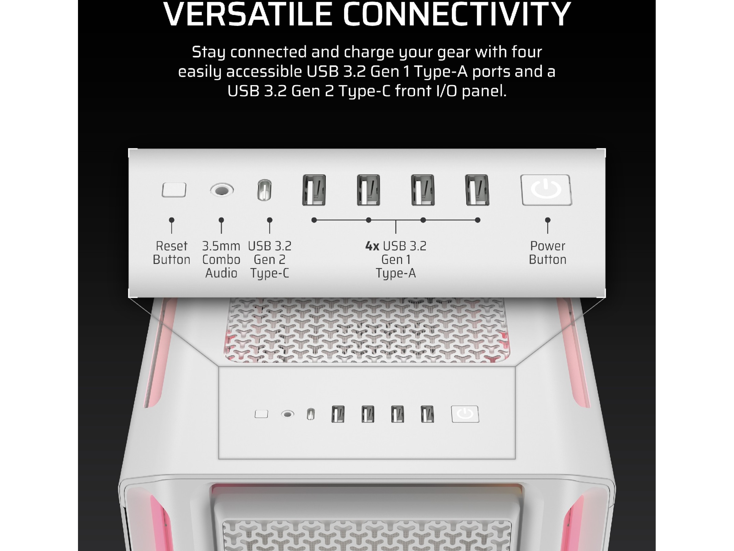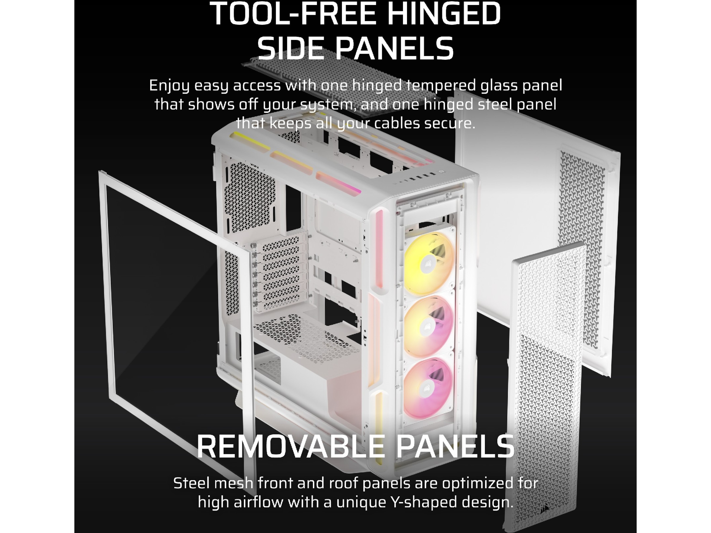 Egenskaber, systemkabinet Aftageligt frontpanel, RapidRoute kabeladministrationssystem (46 mm plads), Nulstillingsknap, Strømknap, CORSAIR iCUE Aurora RGB lysstriber, Sidepanel med hængsler, CORSAIR QuikTurn ventilator skruer, Aftageligt toppanel, Værktøjsfri enhed, Gummikabelhuløjer