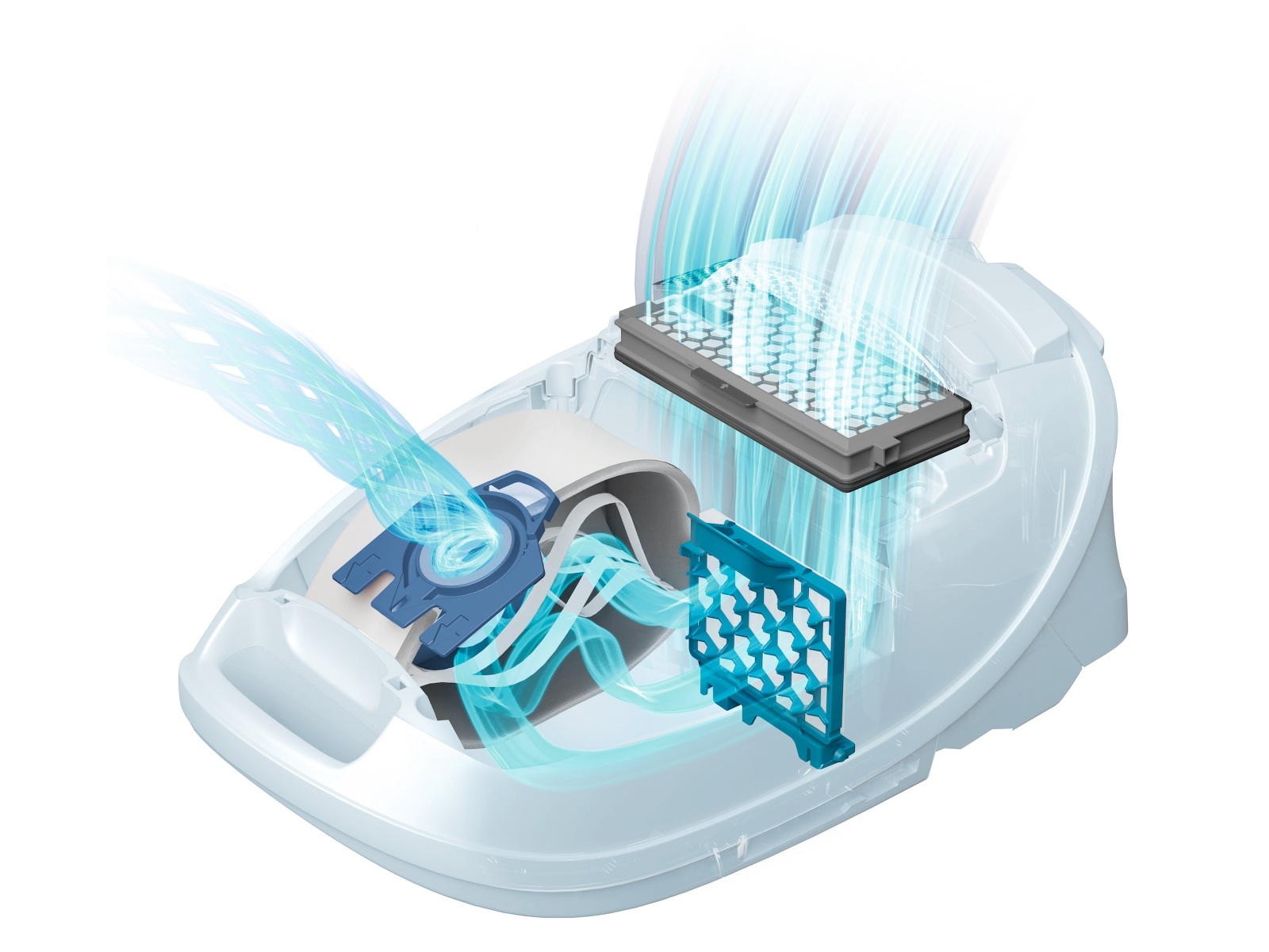 Miele AirClean filtersystemet, som består af Miele HyClean Pure støvsugerpose, motorbeskyttelsesfilter og et udstødningsfilter fra Miele, sikrer maksimal hygiejne. Finstøvbelastningen i rumluften reduceres væsentligt: Virkningen af alle disse komponenter garanterer filtrering af mere end 99,99 % af fint støv . Dette giver dig mulighed for at tage en dyb indånding og rengøringsarbejdet reduceres takket være den grundige rengøring.