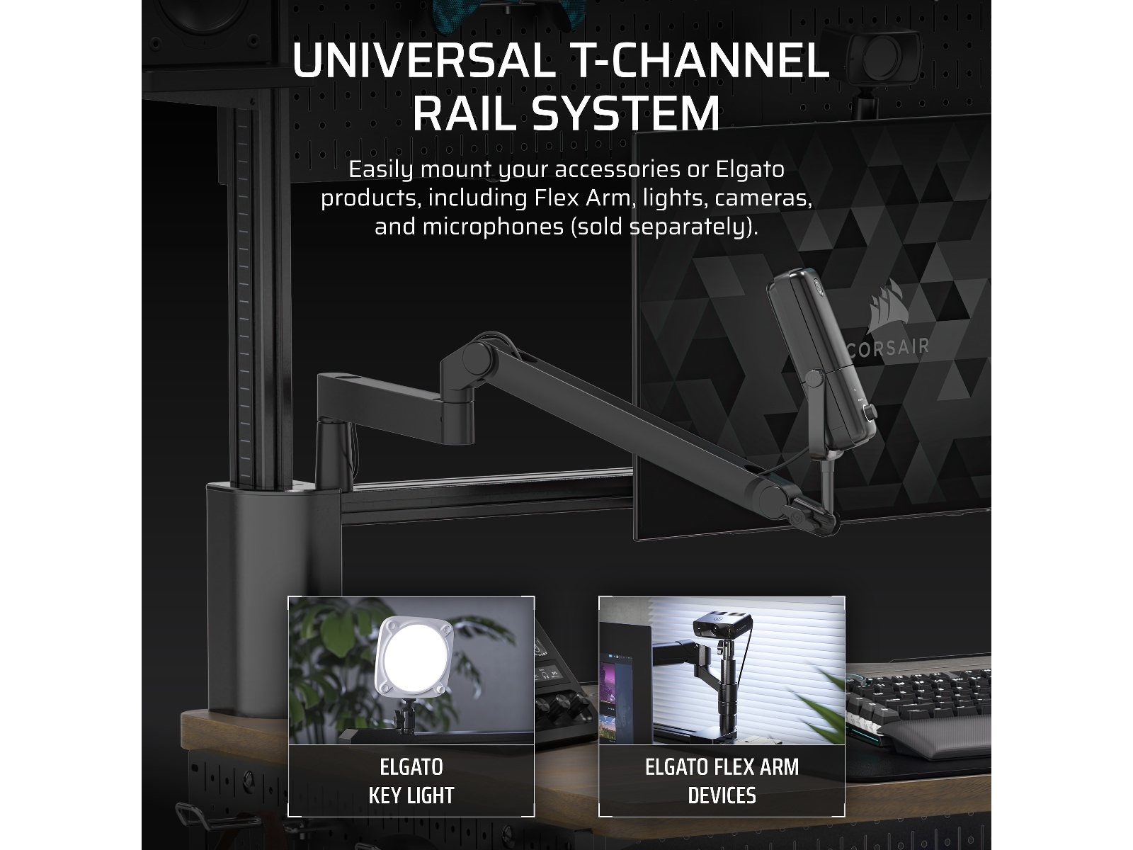 CORSAIR og Elgato ved præcis, hvad indholdsskabere har brug for til at gøre det, de er bedst til. De medfølgende adaptere til Elgato Multi Mount og Flex Arm gør det muligt at montere kameraer, mikrofoner og lys næsten hvor som helst.