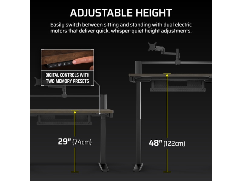 Indstil din ønskede højde med et enkelt tryk på en knap, fra 74 til 122 cm, ved hjælp af den integrerede højdecontroller med LED-display og to hukommelsesindstillinger.