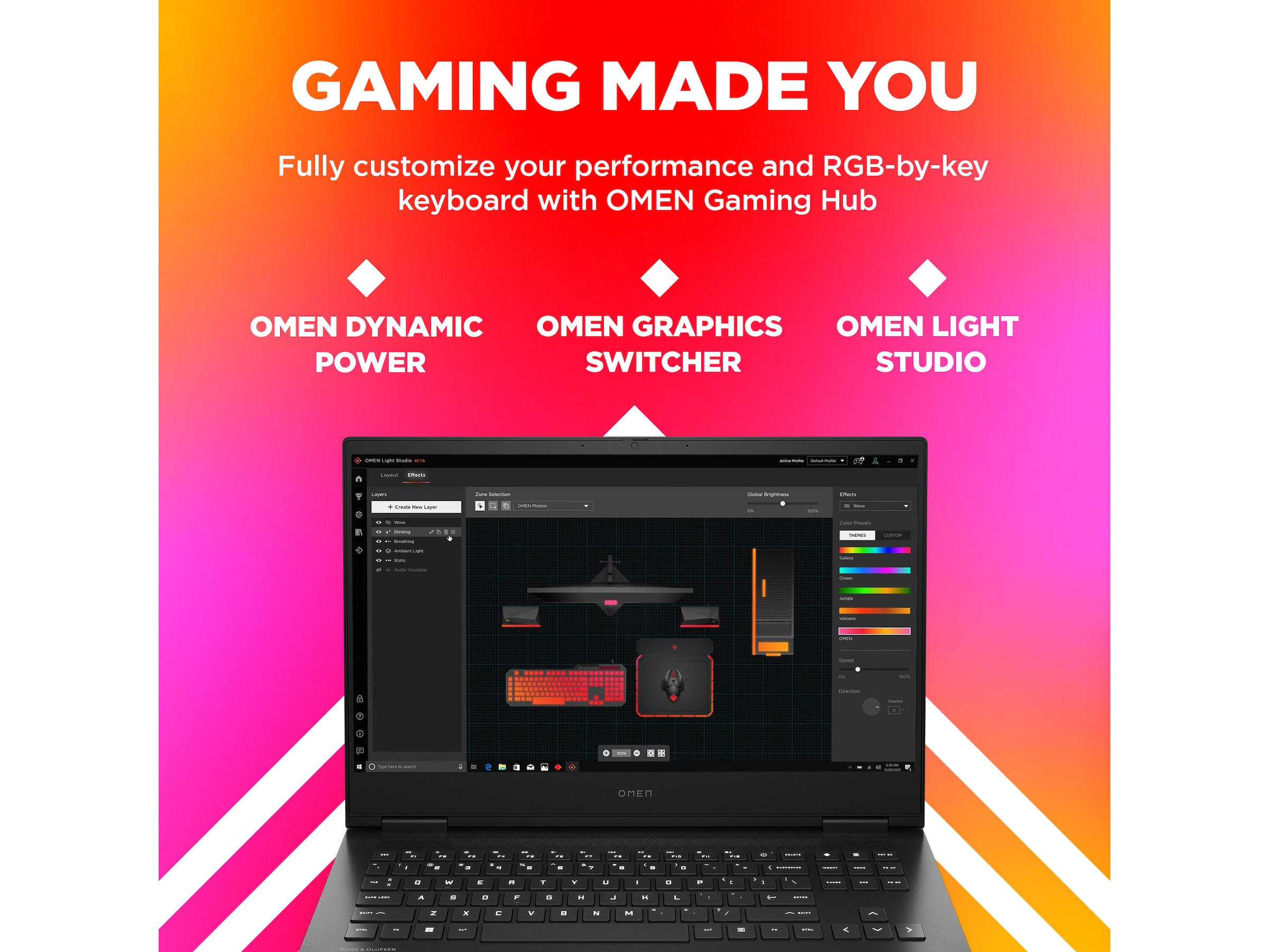 Gør det muligt at bagbelyse 4 uafhængige zoner med forskellige RGBtastaturlys. Der er skitseret WASD-tastertil markering af tastfunktioner. Det hele er nemt at betjene via OMEN Gaming Hub.