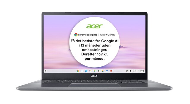 Chat med Gemini direkte fra startskærmen med Chromebook Plus, og få hjælp til at planlægge, skrive, lære og mere med Google AI.