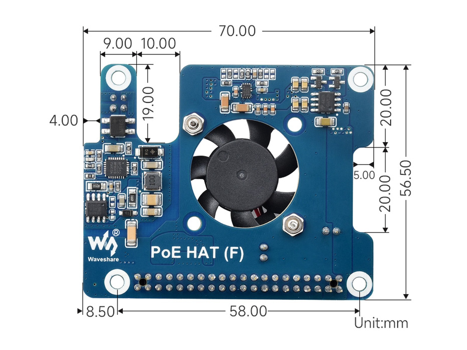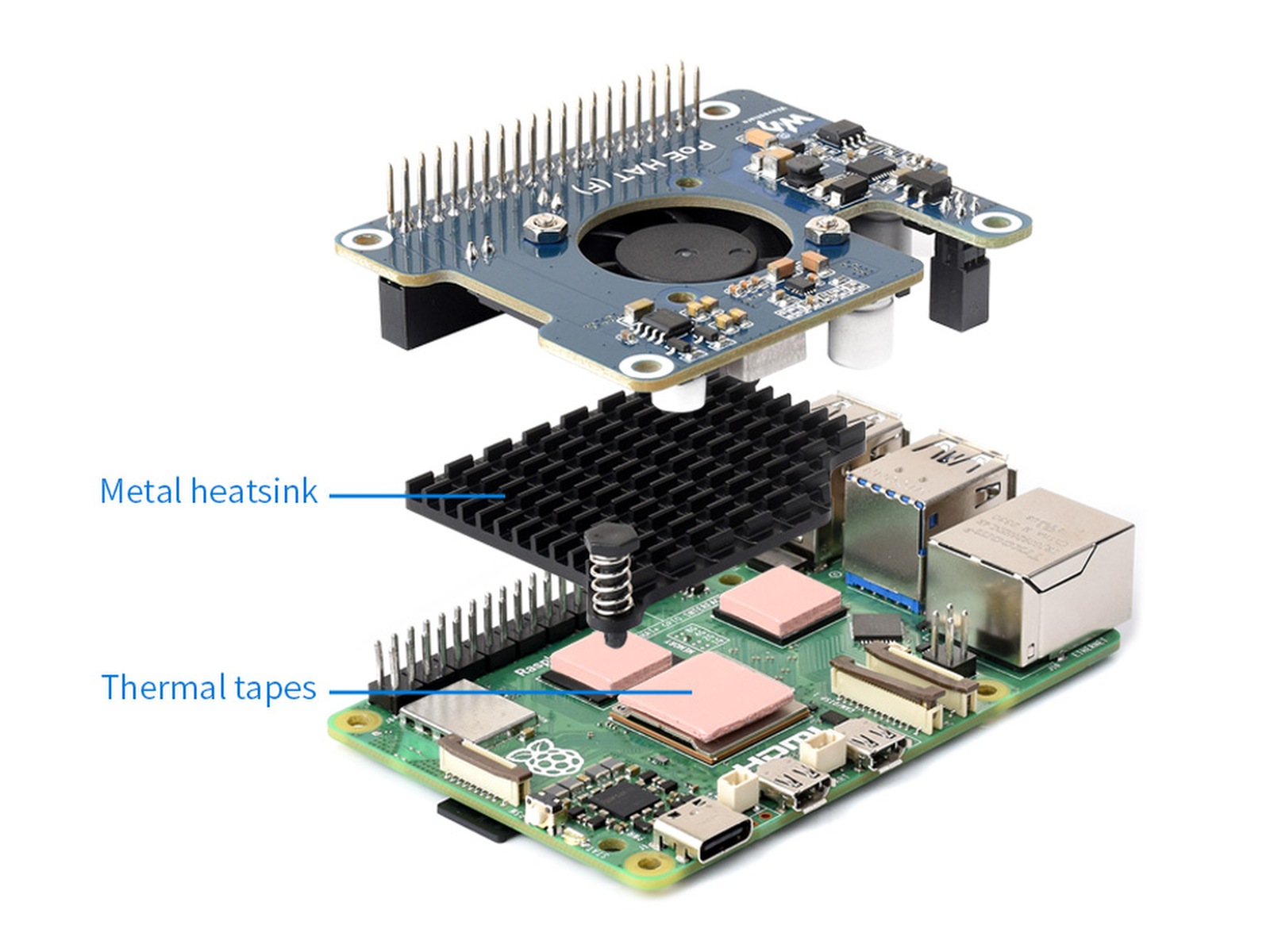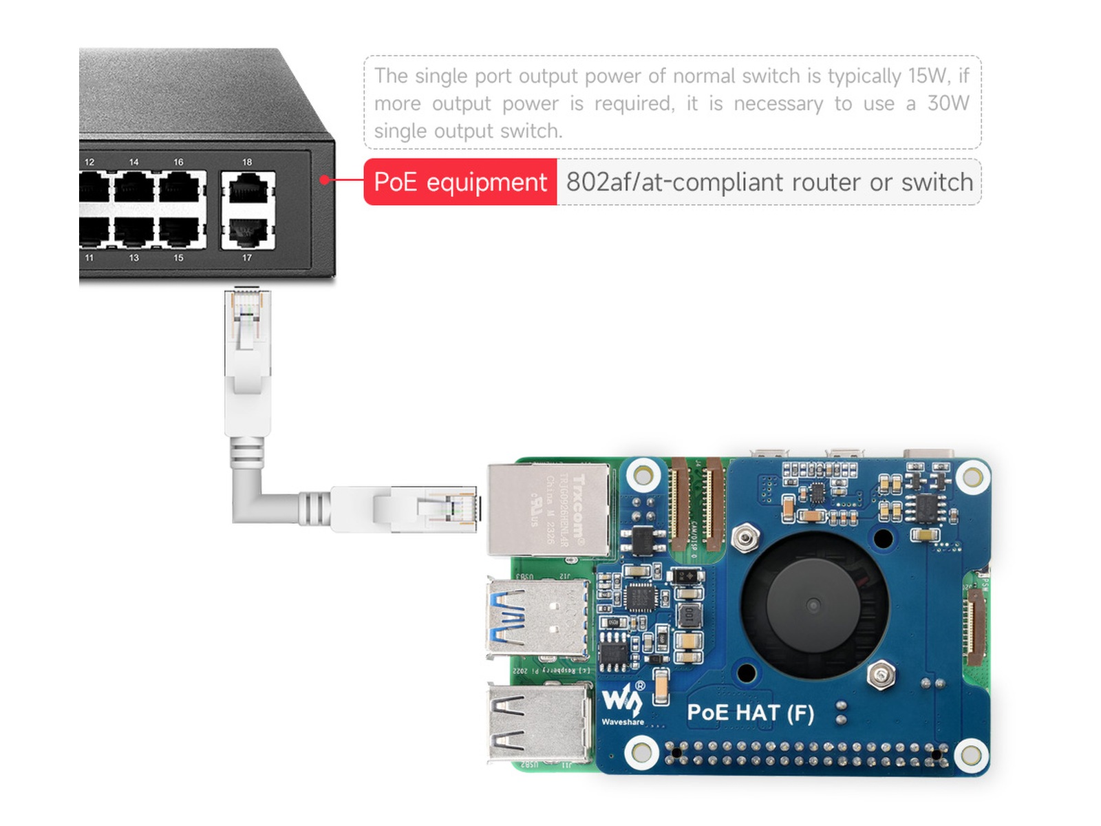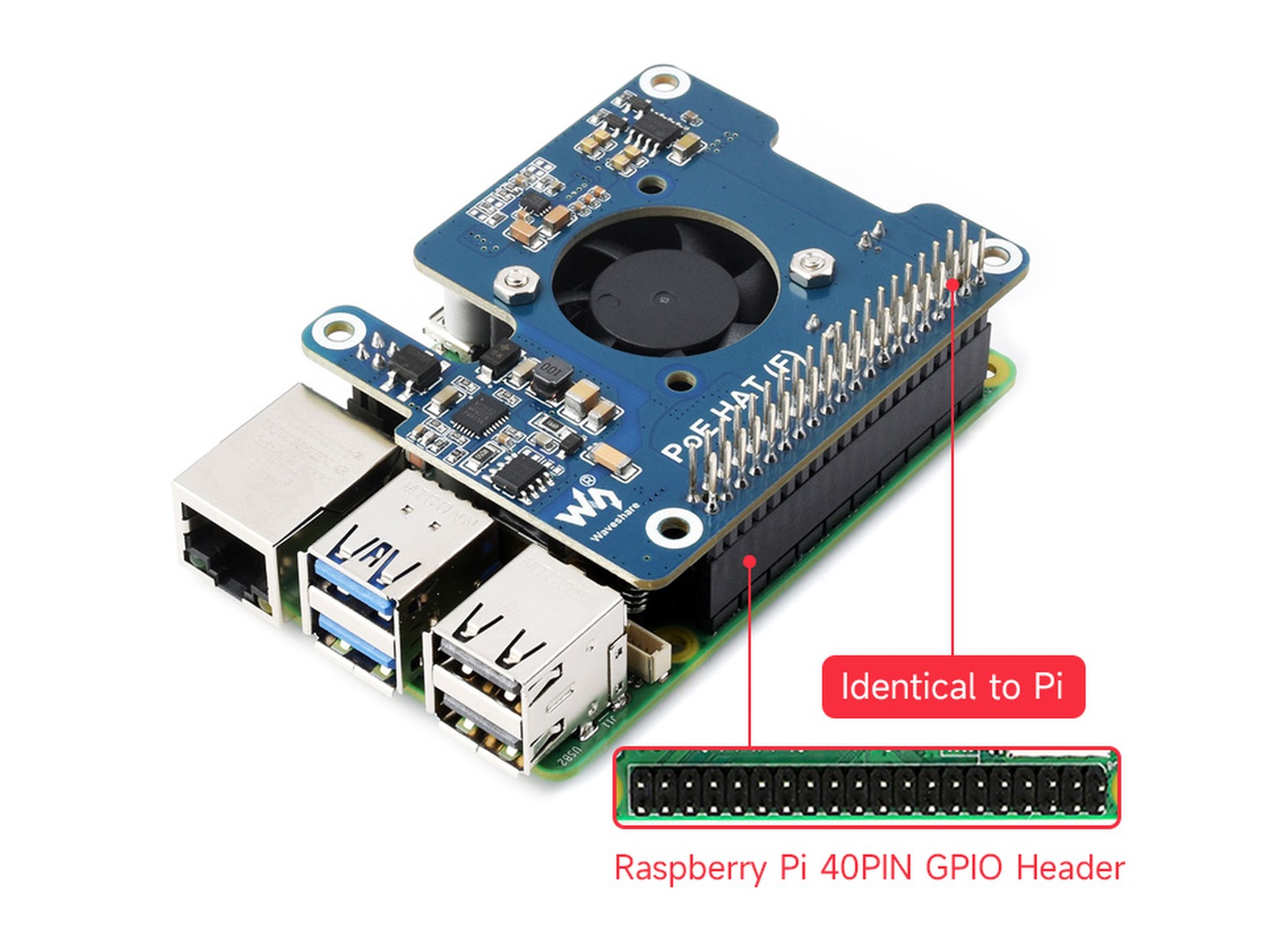 PoE HAT (F) er et 802.3af/at-kompatibelt Power Over Ethernet-tilbehør til Raspberry Pi 5 / CM 5. Ved at bruge denne lille HAT og nogle passende 802.3af/at-kompatible strømforsyningsudstyr, er det muligt at give både netværksforbindelse og strømforsyning til din Raspberry Pi i kun ét Ethernet-kabel.