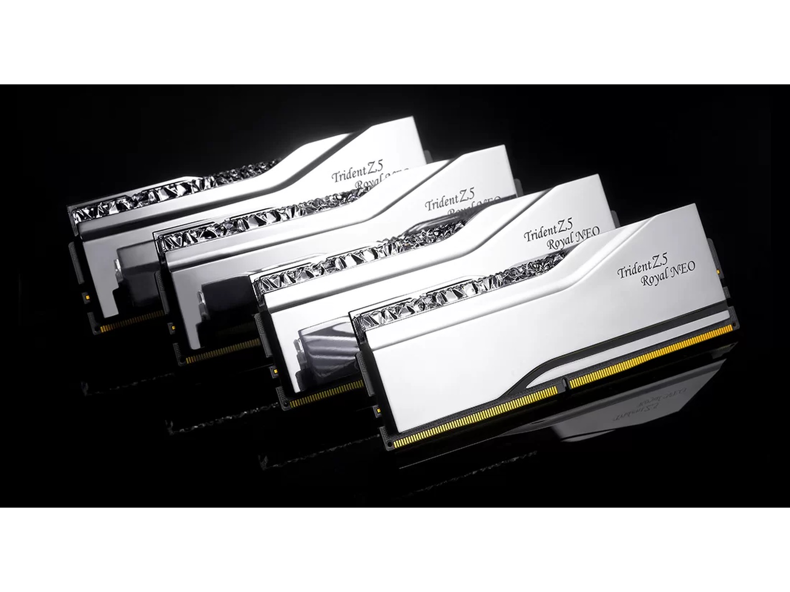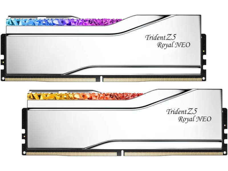 Trident Z5 Royal Neo er luksusklassen af ekstrem overclock performance DDR5 hukommelse designet til AMD AM5 platforme, med et design inspireret af en krone, der inkluderer en krystallinsk lysbar for en pragtfuld visning af tilpasselig RGB belysning og elektropletterede aluminium varmespredere med en spejlbelægning i guld eller sølvfarver.