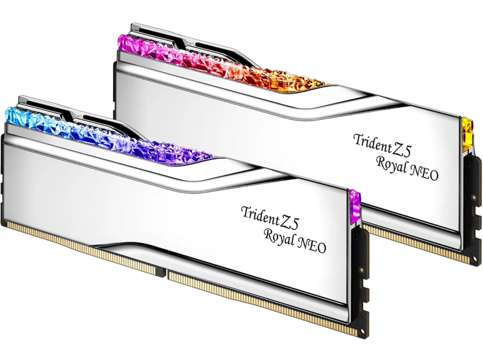 Trident Z5 Royal Neo er luksusklassen af ekstrem overclocking ydeevne DDR5 hukommelse designet til AMD AM5 platforme, med et kronjuvel design med en krystallinsk lysbar for en storslået visning af tilpasselig RGB belysning og elektropolerede aluminium heatspreaders med en spejlet finish i guld eller sølv farver.