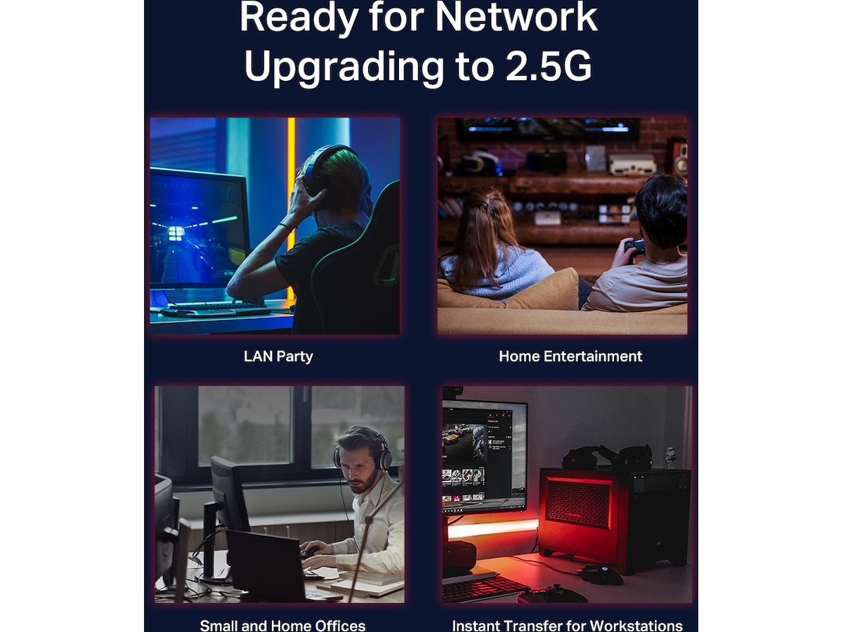 As the flagship 2.5G products, the 5/8-Port desktop switches with 5/8× 2.5-Gigabit ports unlock the highest performance of your Multi-Gig bandwidth and devices, and provide up to 25/40 Gbps of switching capacity. Auto-negotiation 3-speed (100Mb/1G/2.5G) connections sense the link speeds and intelligently adjust for compatibility and optimal performance for all your devices, including 2.5G NAS, 2.5G PCIe adapter, gaming console, VR gaming, 2.5G WiFi 6 AP, 4K video, desktop, and more.