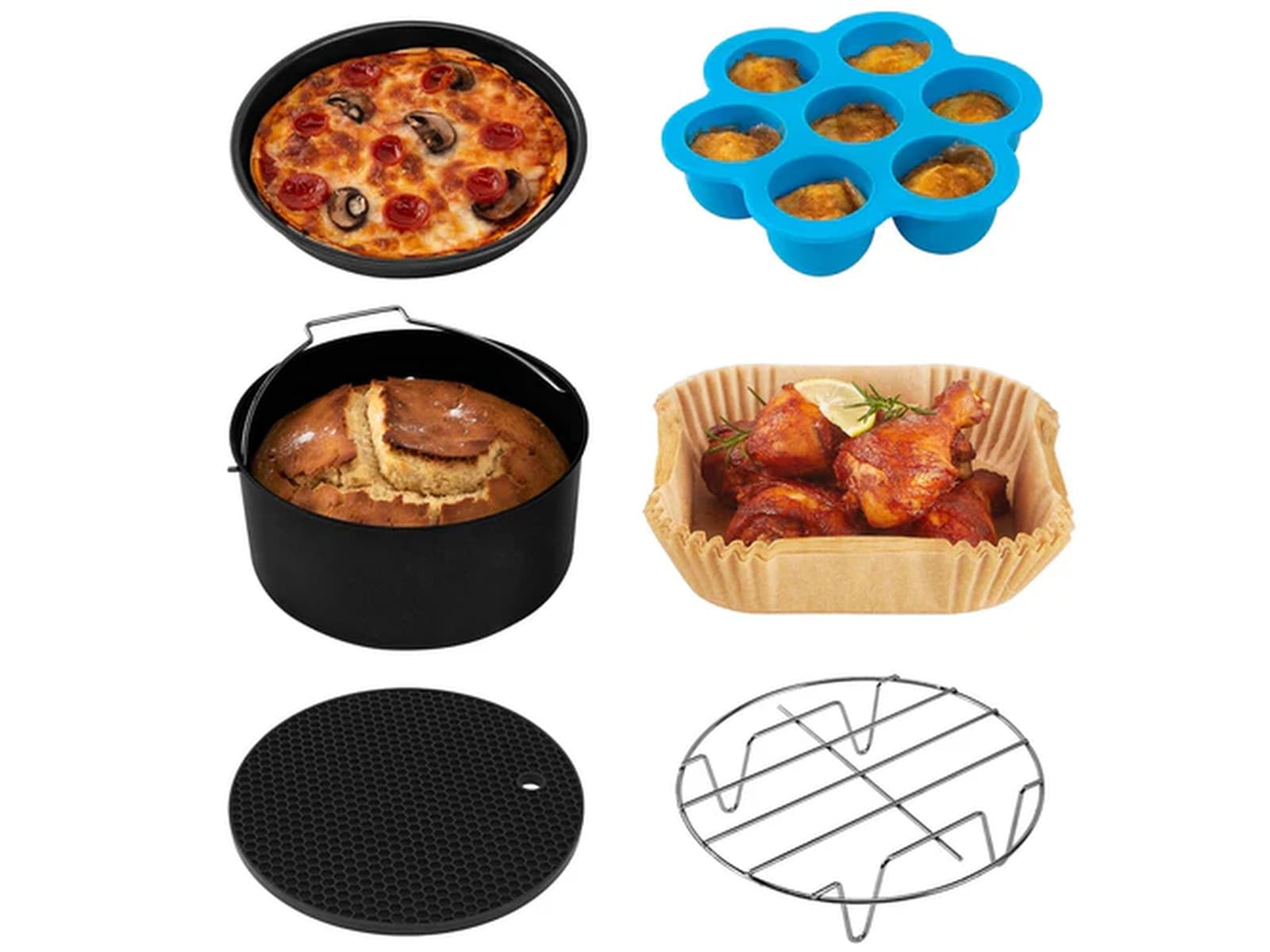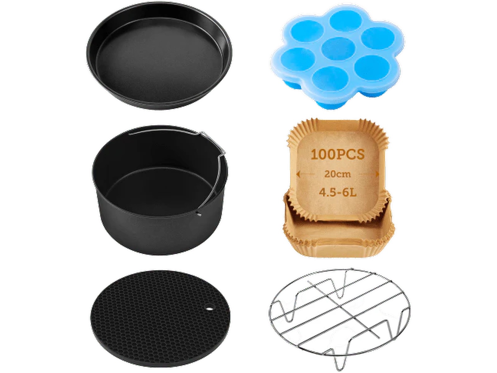 Gør din Cosori air fryer endnu mere alsidig med Air Fryer tilbehørs sættet. Med en kageform, pizzapande, silikone måtte, metalholder, æggebiderform og en stativ med 4 spyd, vil du være i stand til at lave enhver opskrift, du sætter dig for.
