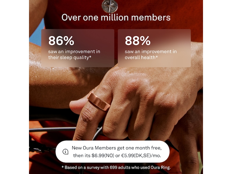 Den første måned af Oura-medlemskabet er gratis med dit køb, efterfølgende $5,99/md. Tilbuddet gælder kun for nye medlemmer. Eller vælg den årlige forudbetalte mulighed for $69,99. Medlemskab er knyttet til din konto via Oura-appen, ikke din fysiske ring.