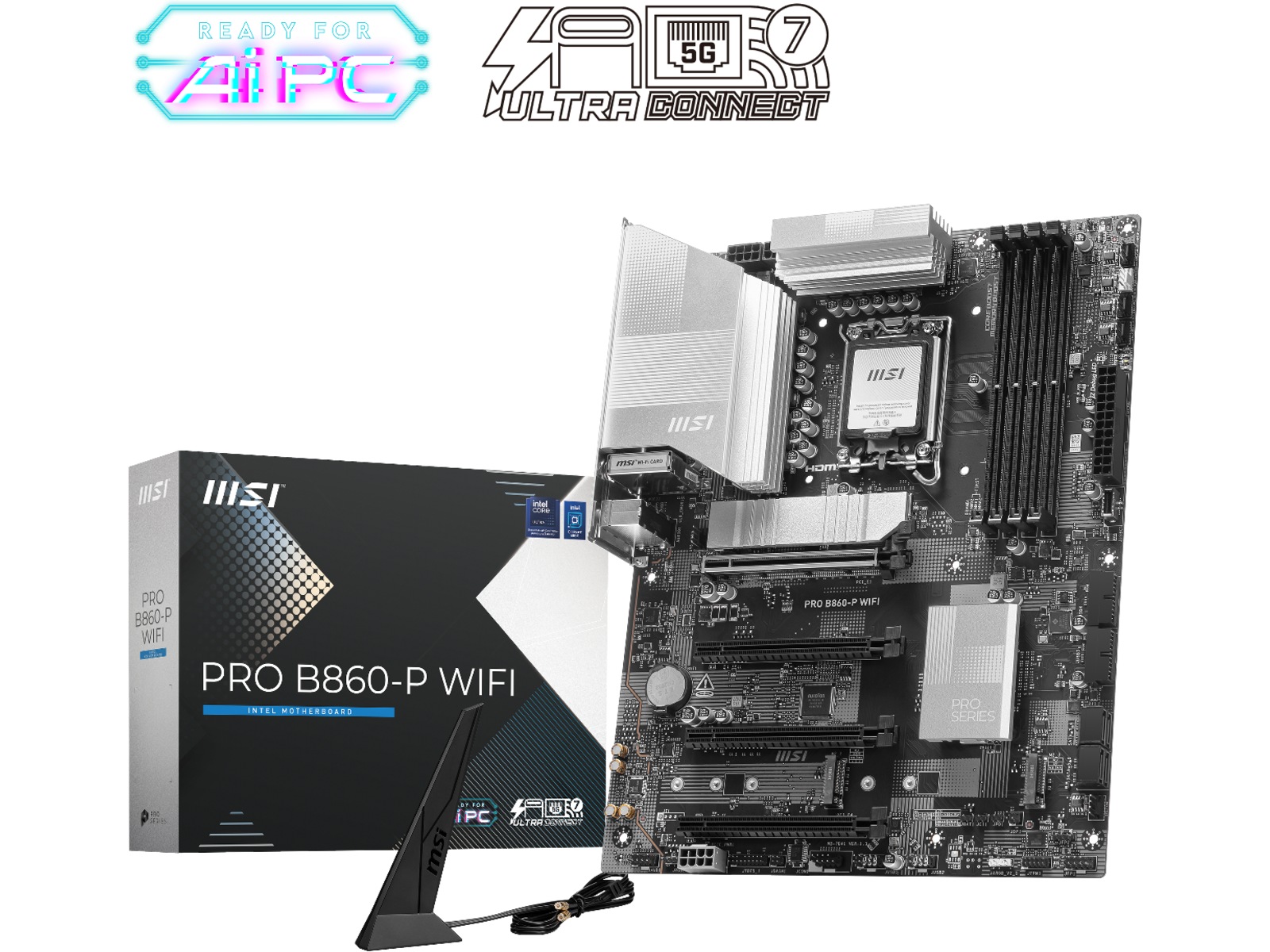 PRO B860-P WIFI tilbyder et enkelt design med et harmonisk sølvfarvet farveskema, der passer perfekt til både hvide og sorte pc-bygninger. Den er konstrueret med mange eksklusive funktioner fra MSI, en ægte Wi-Fi 7 med EZ Antenna, 5G LAN, Thunderbolt 4, PCIe 5.0 M.2, og supplerende PCIe-strøm, klar til Intel® Core™ Ultra-processorer.