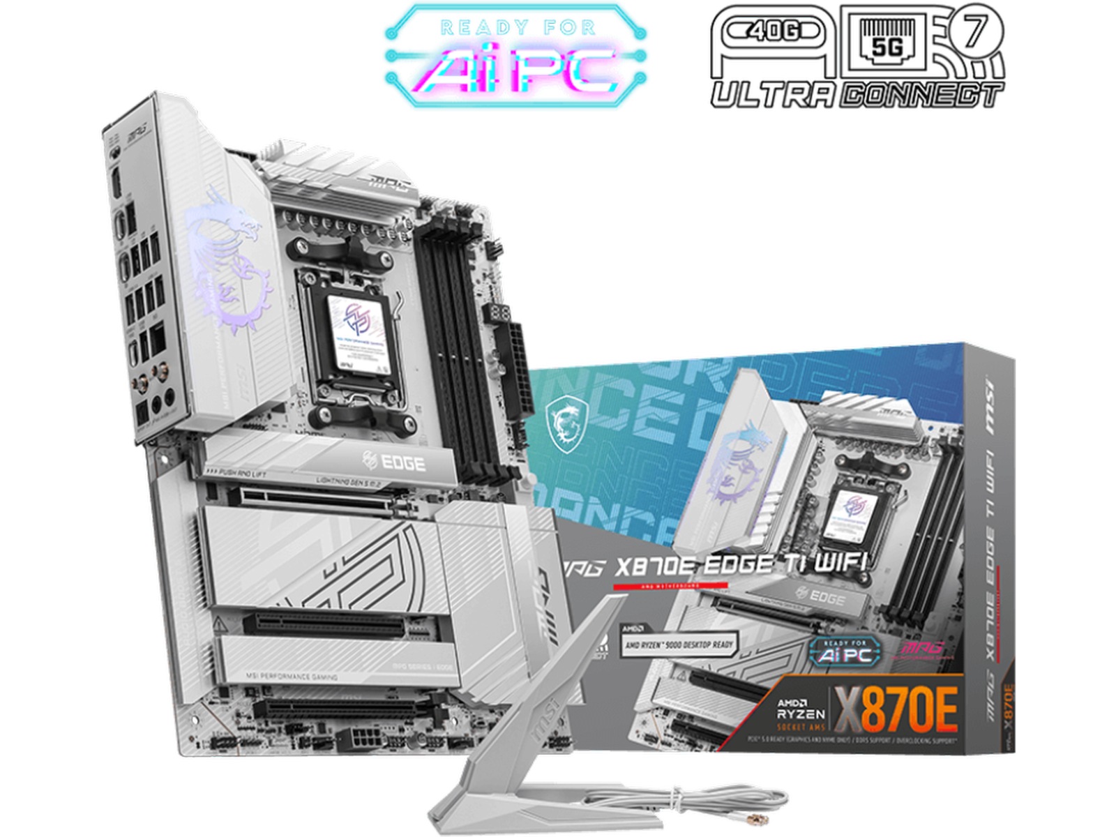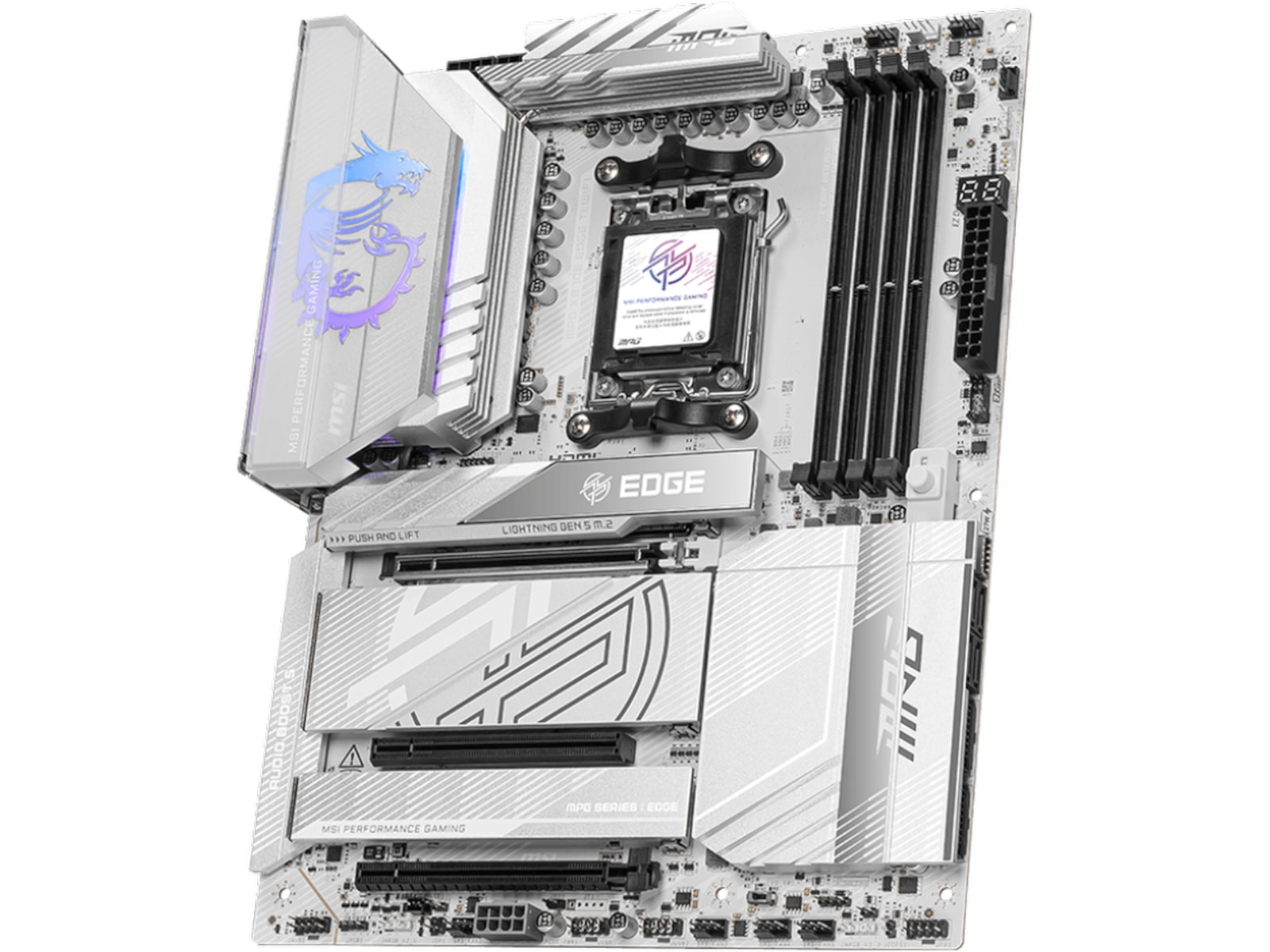 MPG X870E EDGE TI WIFI er dækket af et sølv-hvidt farveskema, så hvide pc-byggere kan vise anderledes identitet. Den er også kraftfuld på grund af dens ægte Wi-Fi 7-løsning, 5G LAN, USB4 og den nyeste PCIe 5.0-kompatibilitet, Supplerende PCIe Power, og dette er det bedste hvide tema X870E ATX-bundkort til AMD Ryzen™ 9000-seriens processorer.