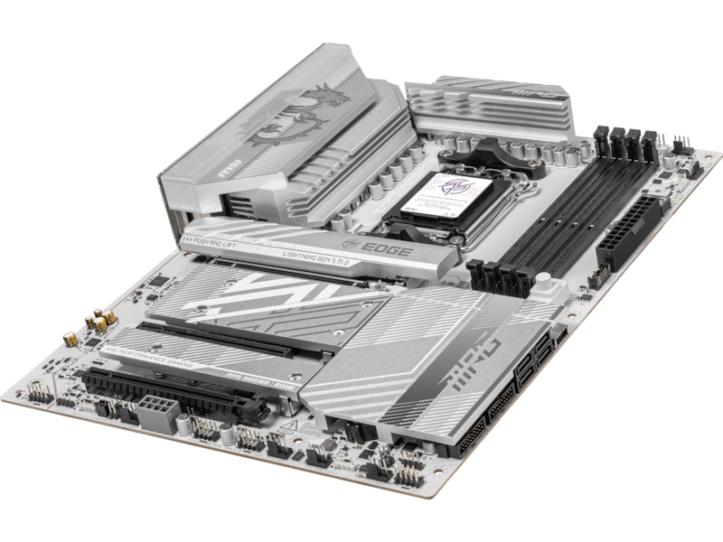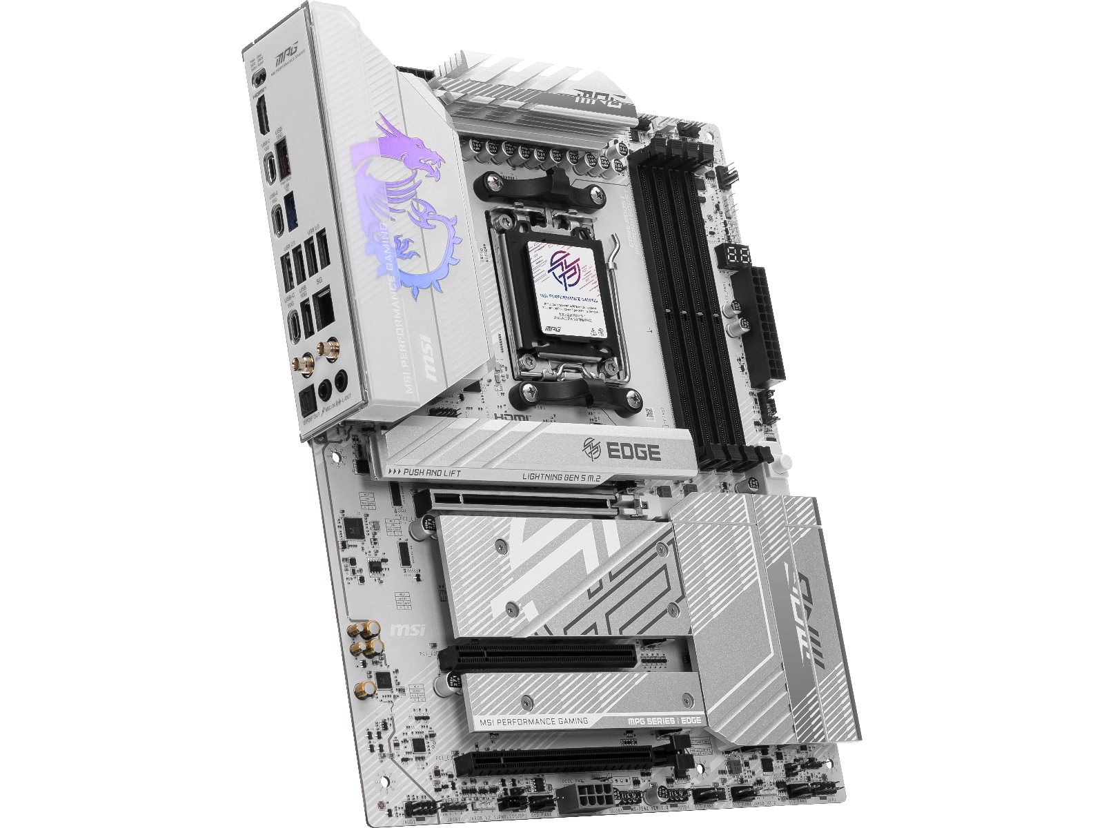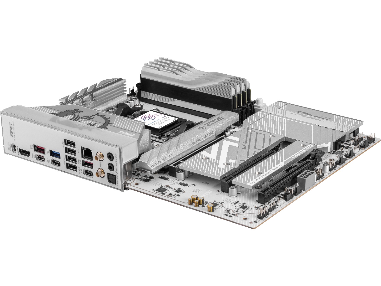 MPG B850 EDGE TI WIFI er dækket med et sølv-hvidt farveskema til elskere af hvide pc-bygger for at vise en anden identitet. Den er også kraftfuld på grund af dens ægte Wi-Fi 7 løsning, 5G LAN og den nyeste PCIe 5.0 kompatibilitet, yderligere PCIe strømforsyning, og dette er det bedste hvide tema B850 ATX bundkort til AMD Ryzen 9000-serien processorer.