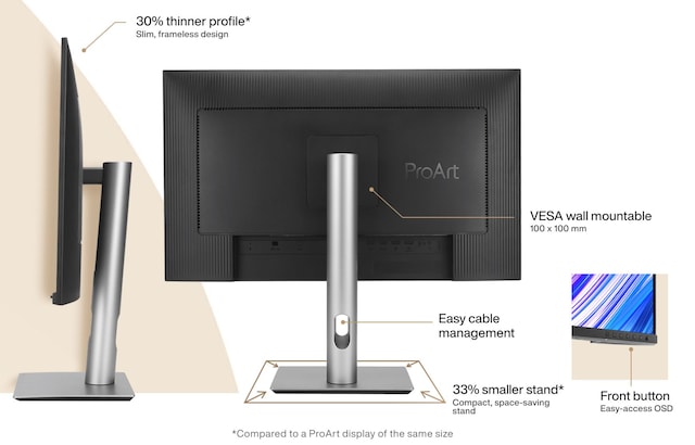 Compared to its predecessor, ProArt Display PA329CRV has a space-saving base that’s 33% smaller, as well as a 30% slimmer profile. Like its contemporaries in the ProArt Display family, PA329CRV feels right at home in a studio or in any living space, with an understated elegance that is a nod to exquisite craftsmanship and uncompromising attention to detail.