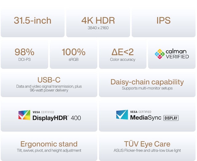 32-inch (31.5-inch viewable), IPS, 4K UHD (3840 x 2160), 98% DCI-P3, Color Accuracy ΔE < 2, Calman Verified, USB-C PD 96W, VESA DisplayHDR 400, VESA MediaSync, Ergonomic Stand, Green Sustainability
