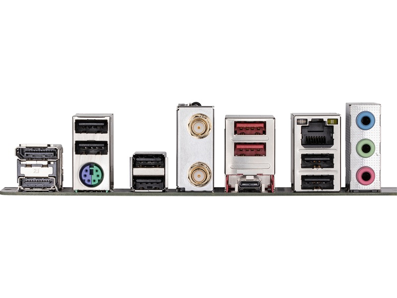 1 x mikrofon - mini-jack, 1 x PS/2-tastatur/mus, 1 x audio linje-ind - mini-jack, 1 x audio linje-ud - mini-jack, 1 x LAN (Gigabit Ethernet), 1 x DisplayPort, 2 x antenne, 2 x USB 3.2 Gen 2, 1 x USB-C 3.2 Gen 1, 6 x USB 2.0, 1 x HDMI