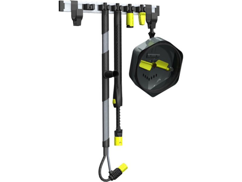 Pakken inkluderer et komplet sæt med ophæng til forskellige typer tilbehør, så du kan holde alt ryddeligt og på plads. Du får to ophæng til slange/terrassevasker, et ophæng til skumkanon, syv ophæng til dyser og lancer samt to ophæng til børster/mopper.
