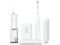 Med på holdet får du også en vandflosser, der bruger fem justerbare vandtryk til at spule alt væk, der gemmer sig mellem tænderne. Den er med andre ord en lille højtryksrenser til dit smil.